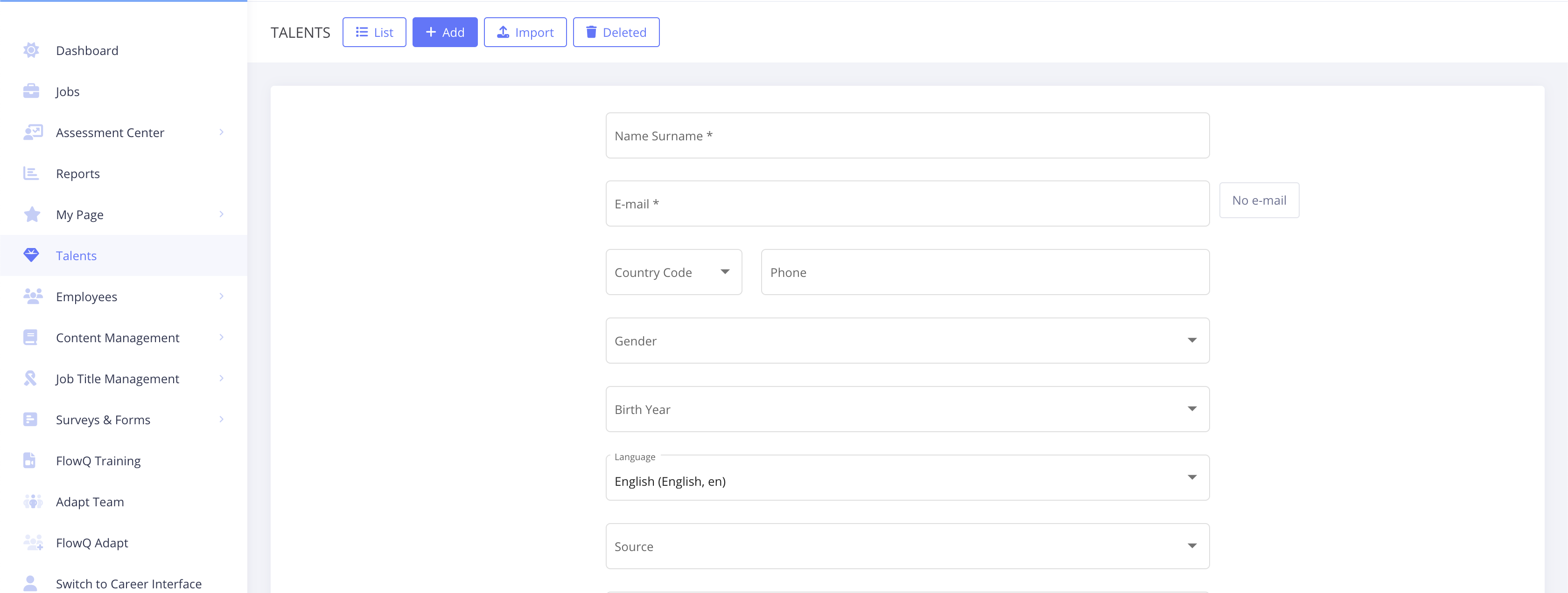 Adding talents to FlowQ system can be done through the “Jobs” and “Talents” sections.