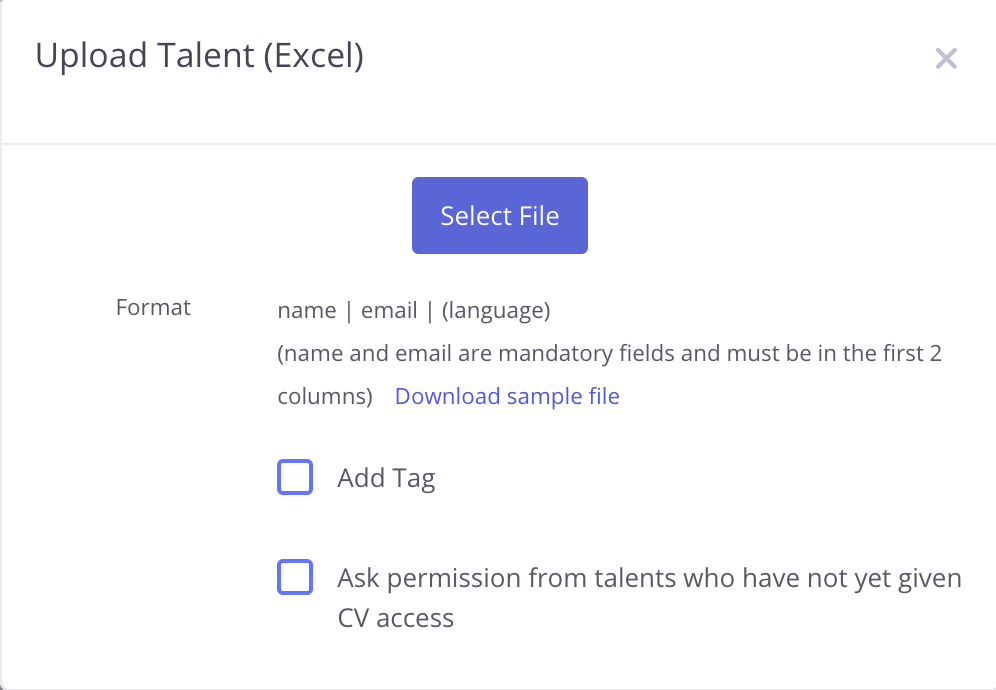 Talents should be added via uploading a file. If the file will be uploaded with a FlowQ format, then name and email are mandatory fields and must be in the first 2 columns.