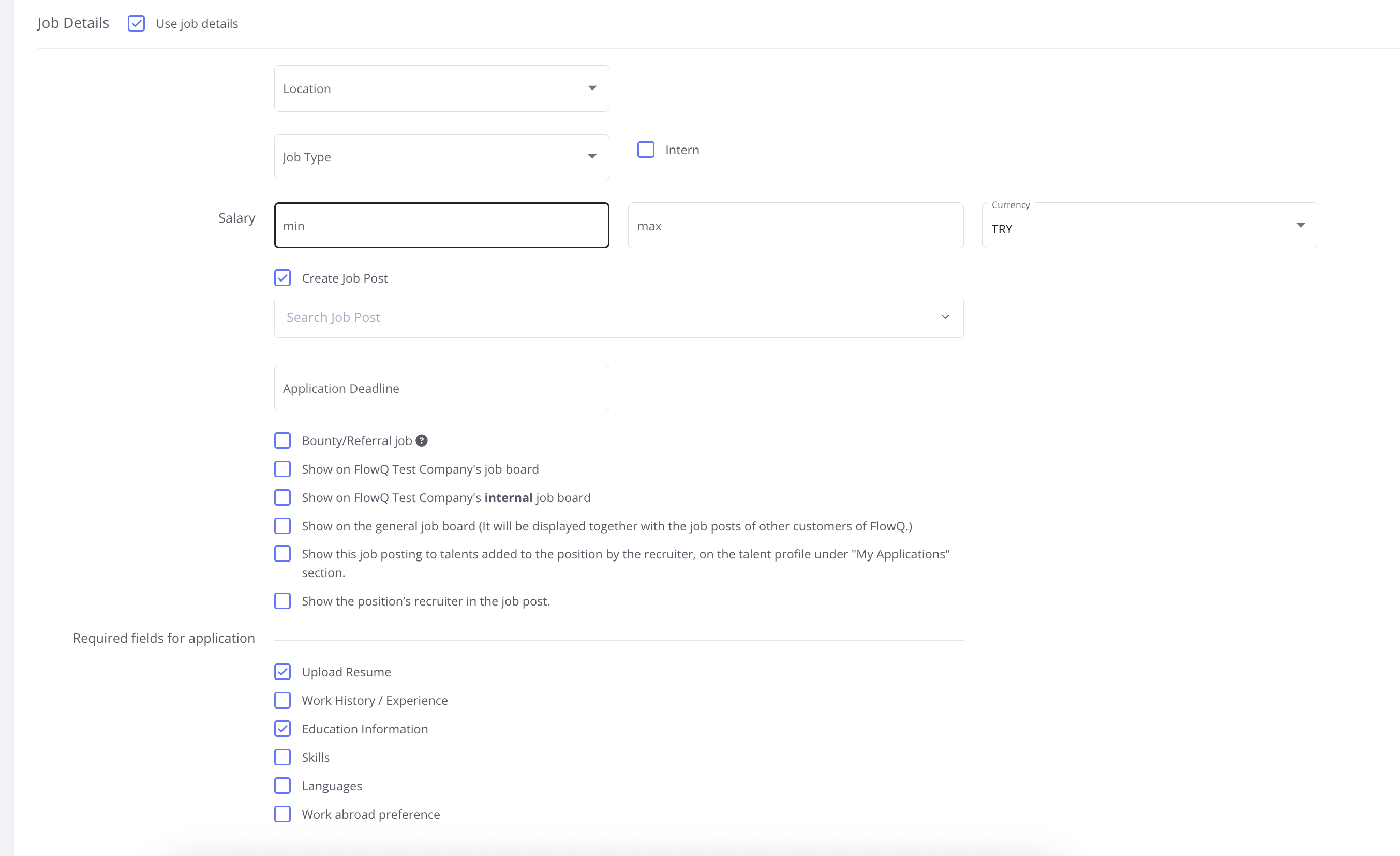 "Show on general job board": The job post will be displayed together with the job posts of other customers of FlowQ.