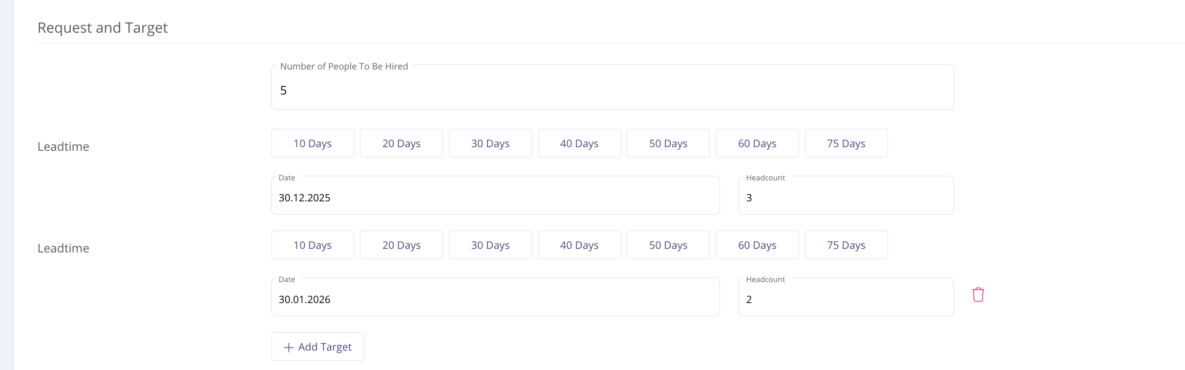 “Target date” is used especially for mass hirings. For instance; if the aim is to hire 5 people in total until a certain date, “target date” can be selected. In this case 3 people can be hired by the end of April and 2 people by the end of May.