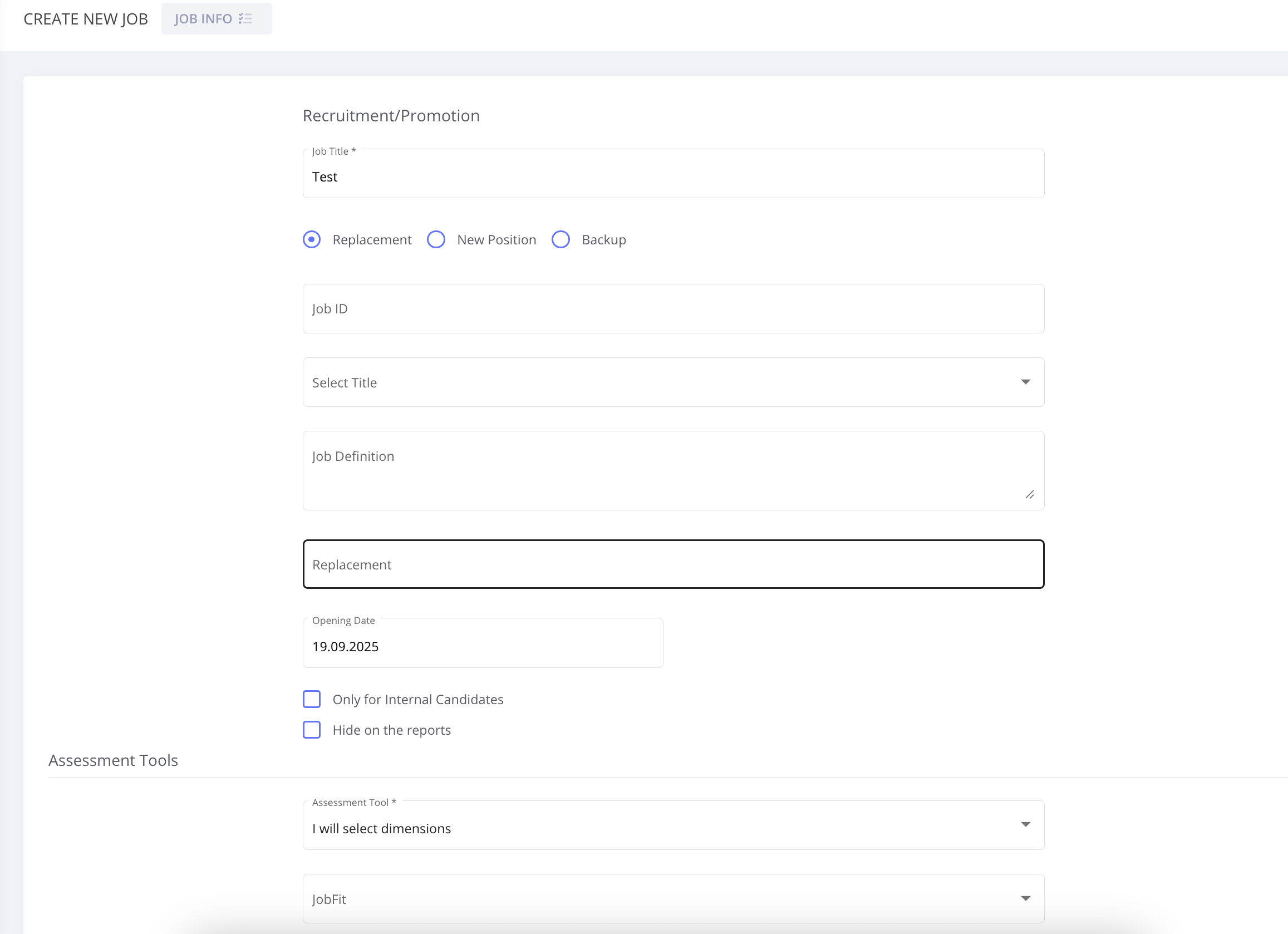 Job Title field should be filled. Replacement/New Position selection should be completed.