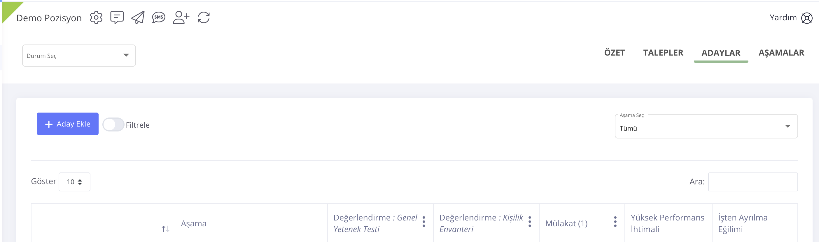 İlgili pozisyon içerisinde yer alan “Adaylar” sekmesinden aday ekleme