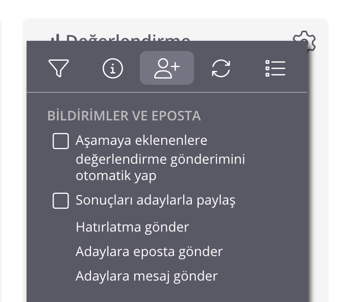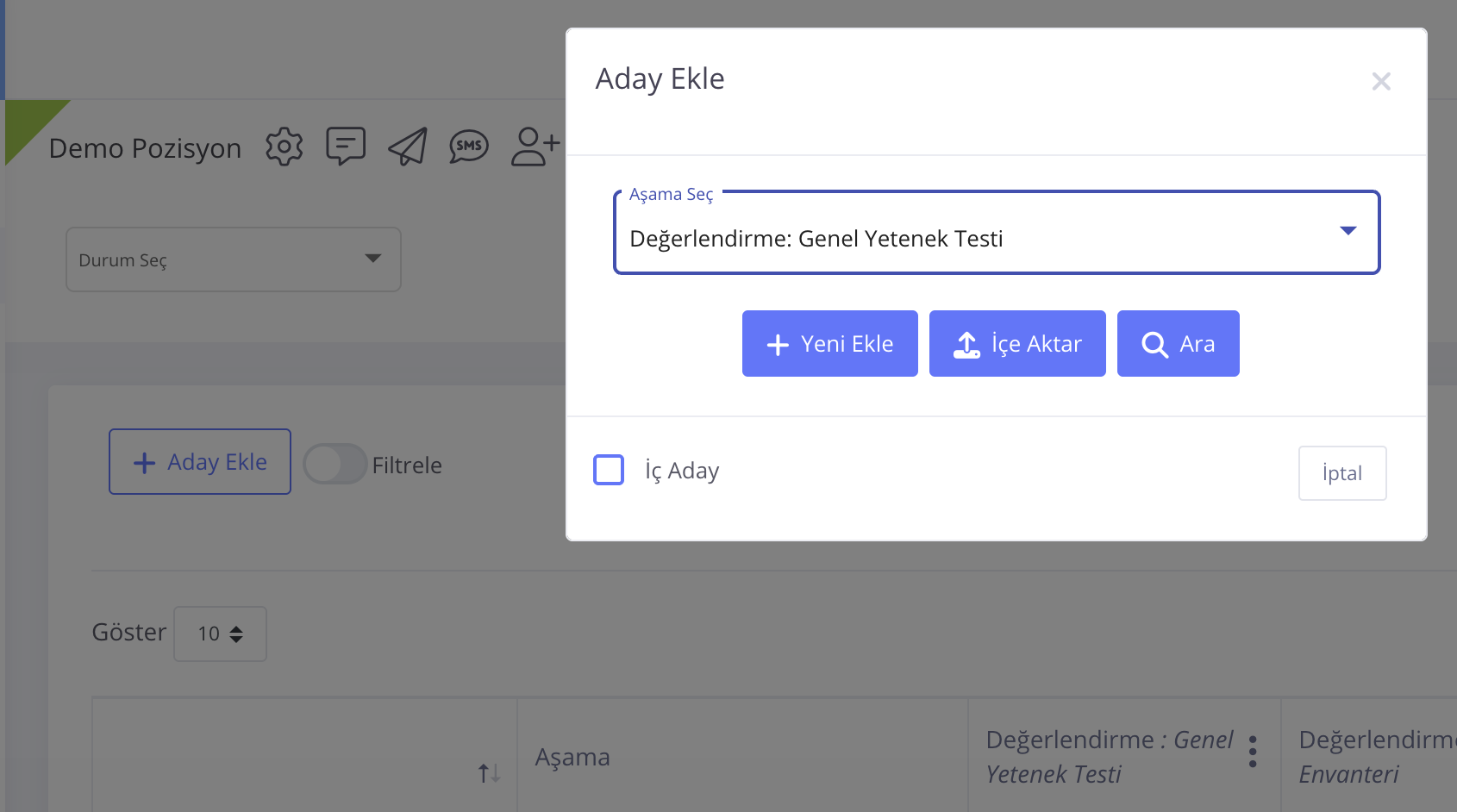 Aşama menüsünden aday ekleme işlemi gerçekleştirildiğinde adaylar seçili aşamaya eklenir. Adaylar; "Yeni Ekle", "İçe Aktar" ve "Ara" seçeneklerinden biri seçilerek eklenir.
