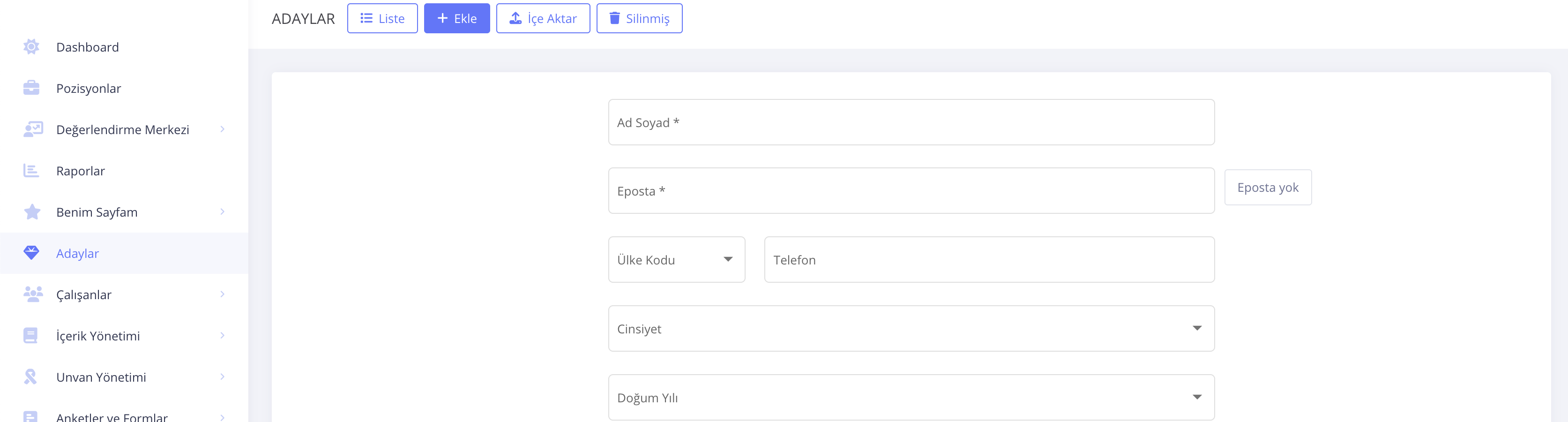 Adaylar sekmesinden "Ekle" butonu seçilerek aday ekleme işlemi, Ad Soyad, E-posta, Cinsiyet, Doğum Yılı, Telefon, Etiket, Dil ve Kaynak bilgileri doldurularak gerçekleştirilir. Aday ekleme işlemi için Ad Soyad ve E-posta alanlarının doldurulması zorunludur. Sayfanın en altında çıkan “Bundan sonra bir tane daha ekle” seçeceği ile birden fazla aday sırayla eklenebilir.