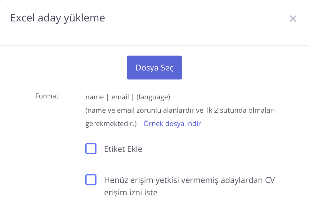 Kariyer.net seçimi sadece kariyer.net üzerinden indirilen excel formatındaki aday listesi için kullanılır. Ad, Soyad ve e-posta sütunlarının olması zorunludur.