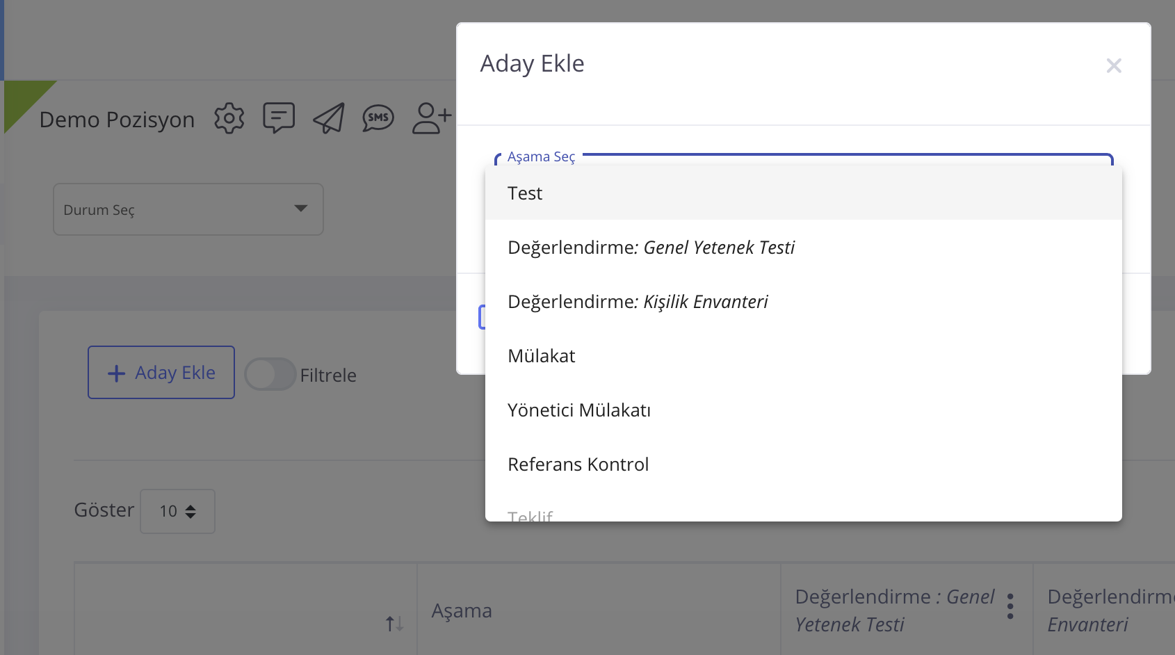 Aday ekle butonuna tıklandığında, ekranda adayın ekleneceği aşama için Aşama Seç sayfası görüntülenir.
