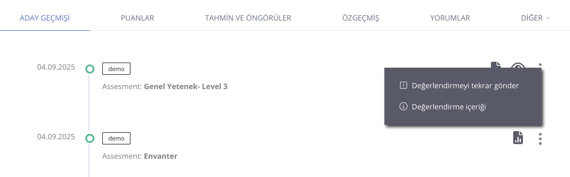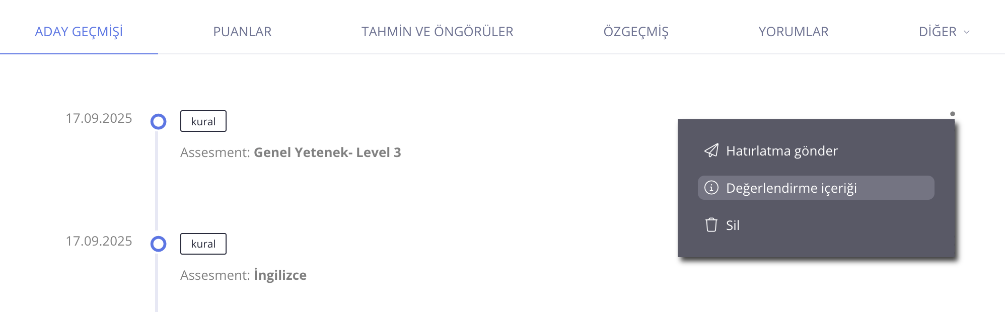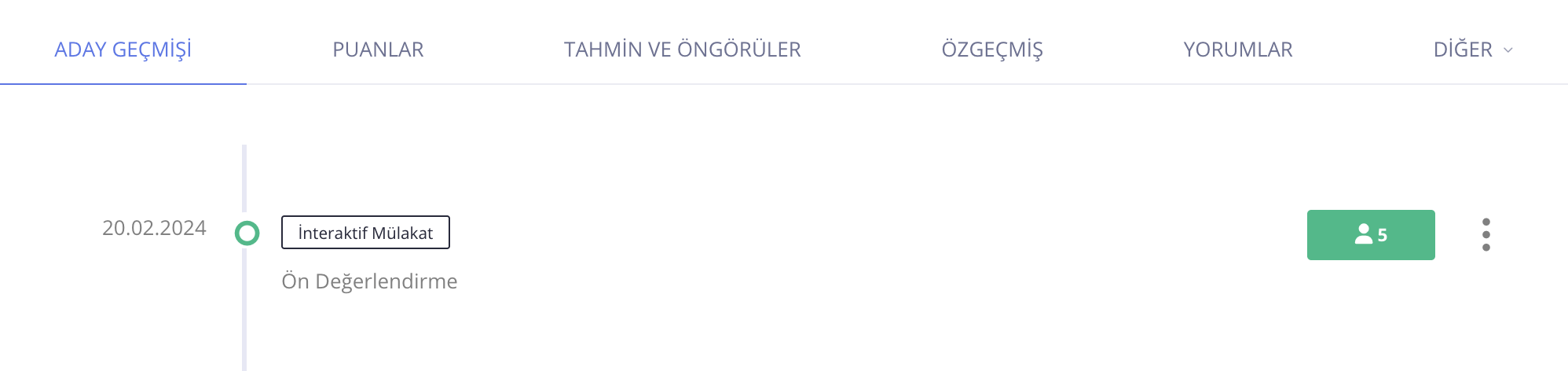 Bu alanda, adayın geçmiş bilgileri yer alır. Bu bilgiler, adayın eklendiği pozisyon, adaya gönderilen değerlendirme ve anket, aday olumsuz, aday kısa/uzun listeye eklendi vb. şeklindedir. Değerlendirme sonuçları, ilgili değerlendirmenin yanında bulunan raporlarda verilir.