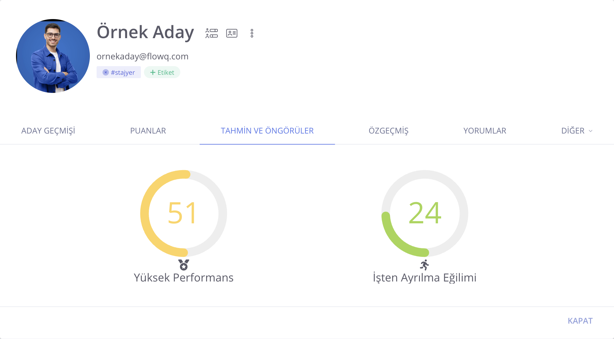 Tahmin ve Öngörüler bölümünde, adayın değerlendirme sonuçlarına göre performans tahmini ve işten ayrılma yüzdesi gösterilir. Aday öngörüleri seviye 3 Genel Yetenek Test(GYT) skorundan hesaplanmaktadır.