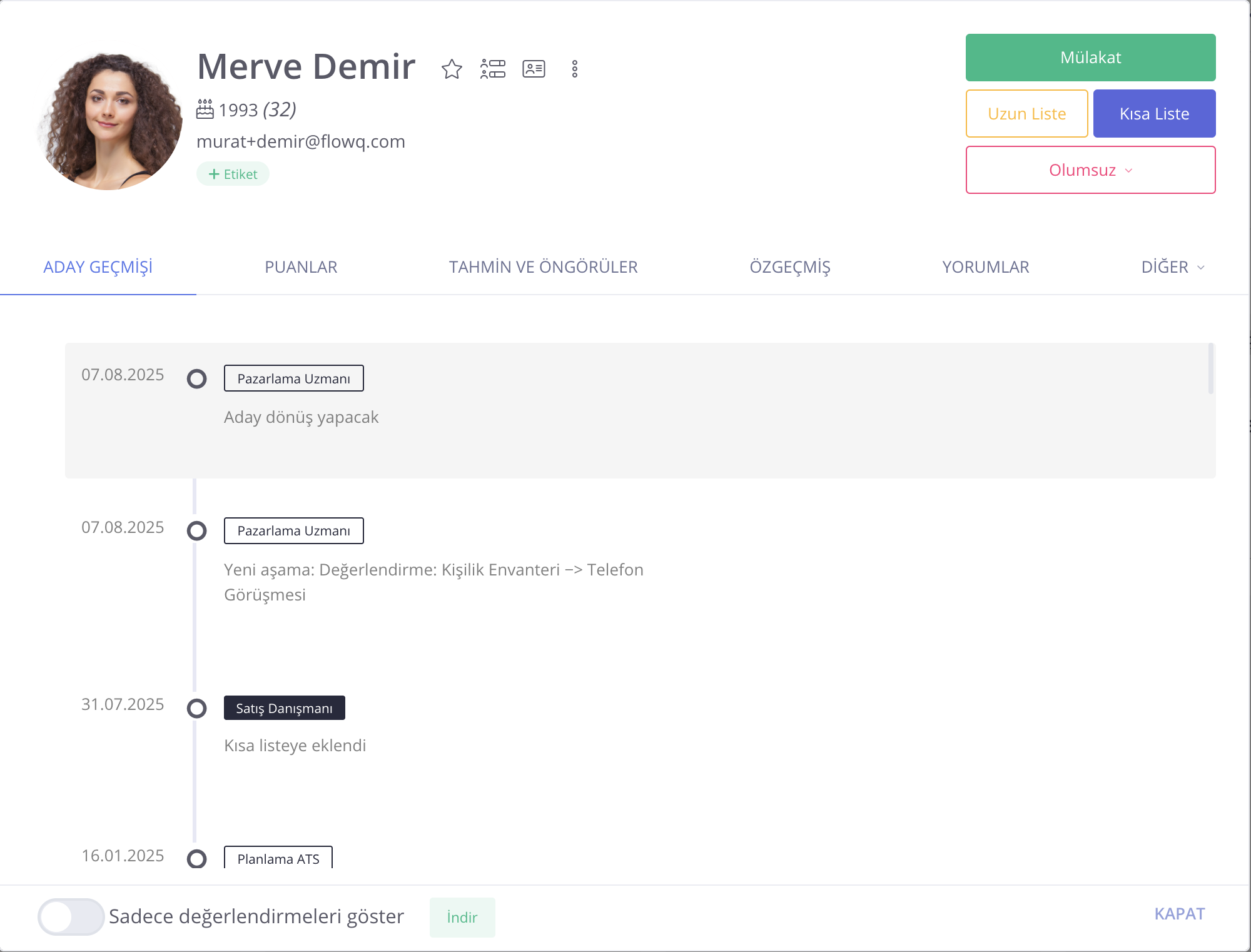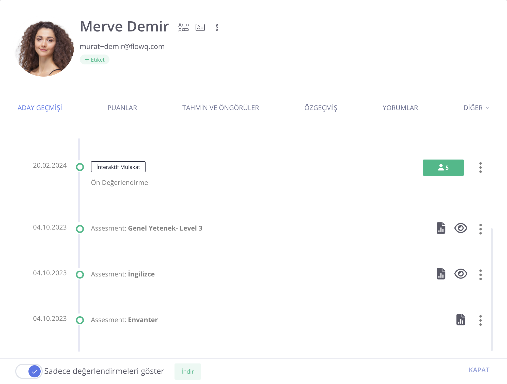 Kullanıcı aday geçmişi sekmesi altında yer alan “Sadece değerlendirmeleri göster” seçeneği ile adayın yalnızca değerlendirme sonuçlarını görüntüleyebilir.