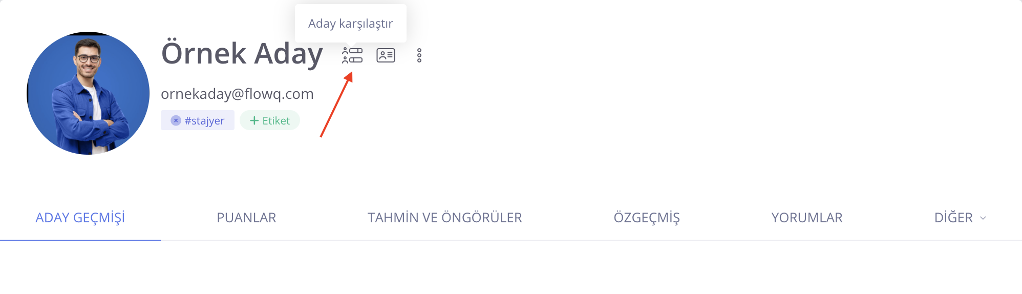 Karşılaştırmak istenilen aday için, aday kartında yer alan karşılaştırma ikonuna tıklanır. Bu işlem, karşılaştırma yapmak istenilen diğer adaylar için de yapılır.