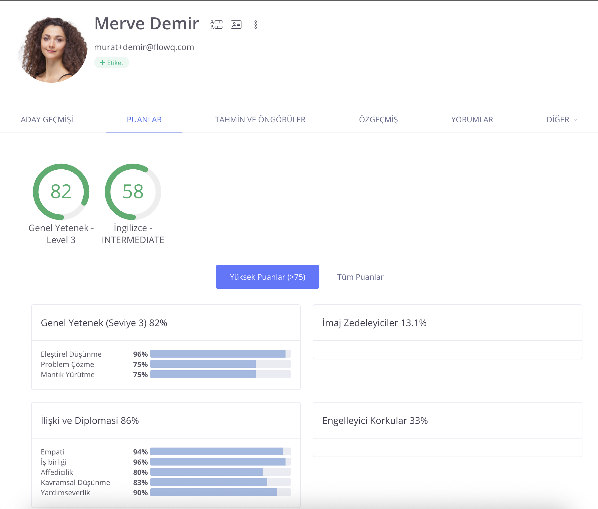 Adayın tamamladığı değerlendirme sonuçları, "Puanlar" alanında yer alır.