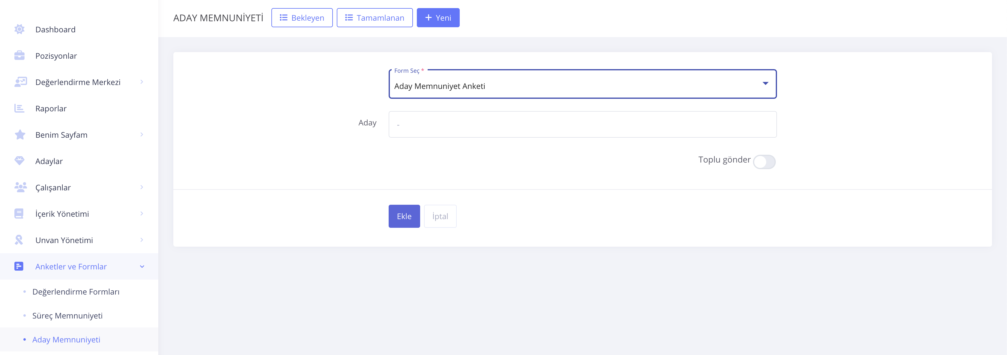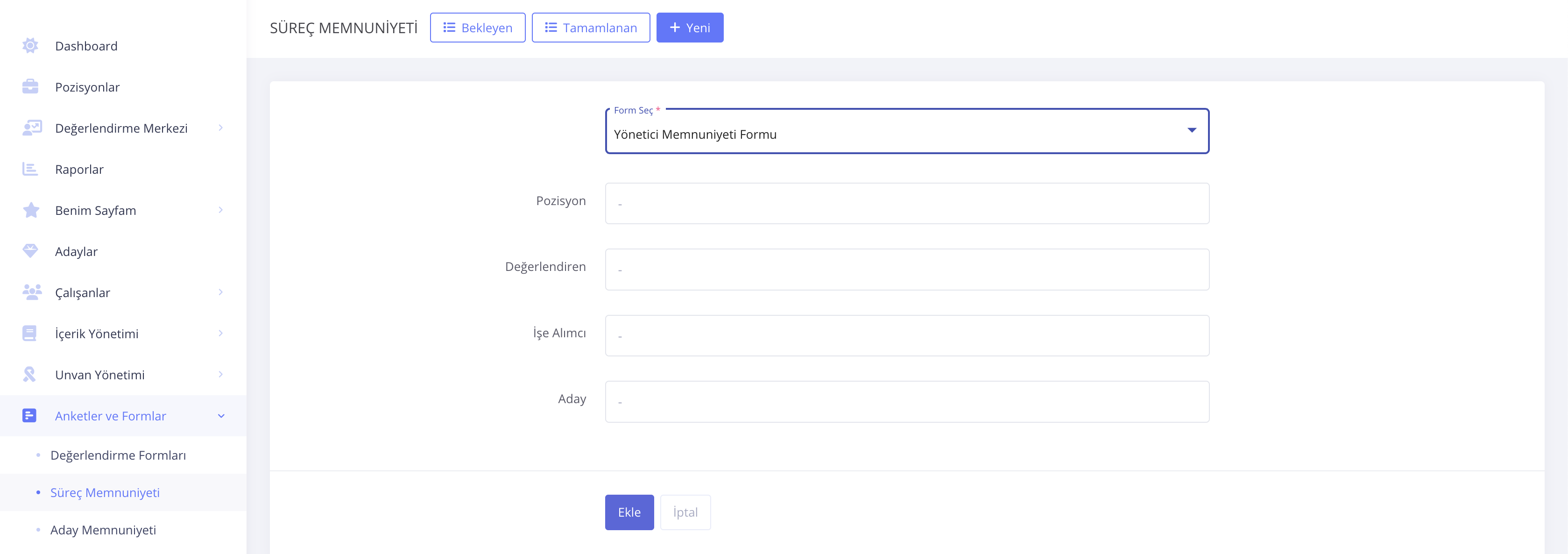 Adayın bulunduğu süreçteki memnuniyet düzeyini ölçen formlardır. Aday Memnuniyeti sekmesi Bekleyen, Tamamlanan ve Yeni olmak üzere üç bölümden oluşur.