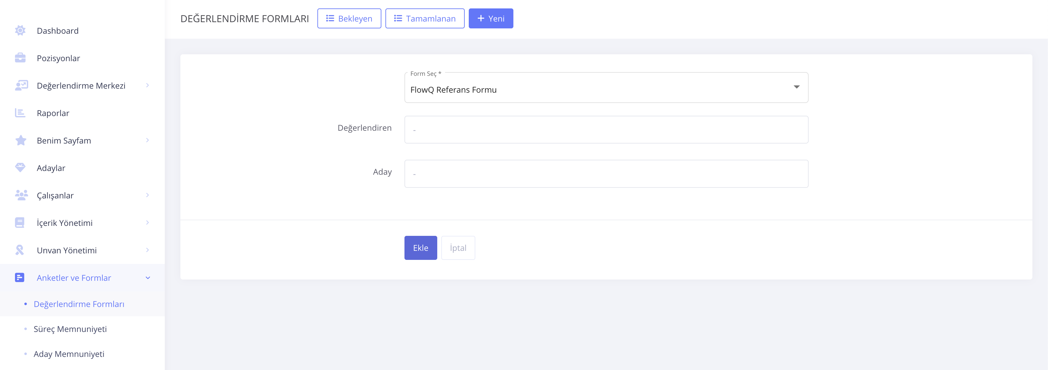 Değerlendirme formları, işe alınan veya süreçteki adayların değerlendirildiği formlardır. Değerlendirme formları sekmesi Bekleyen, Tamamlanan ve Yeni olmak üzere üç bölümden oluşur.