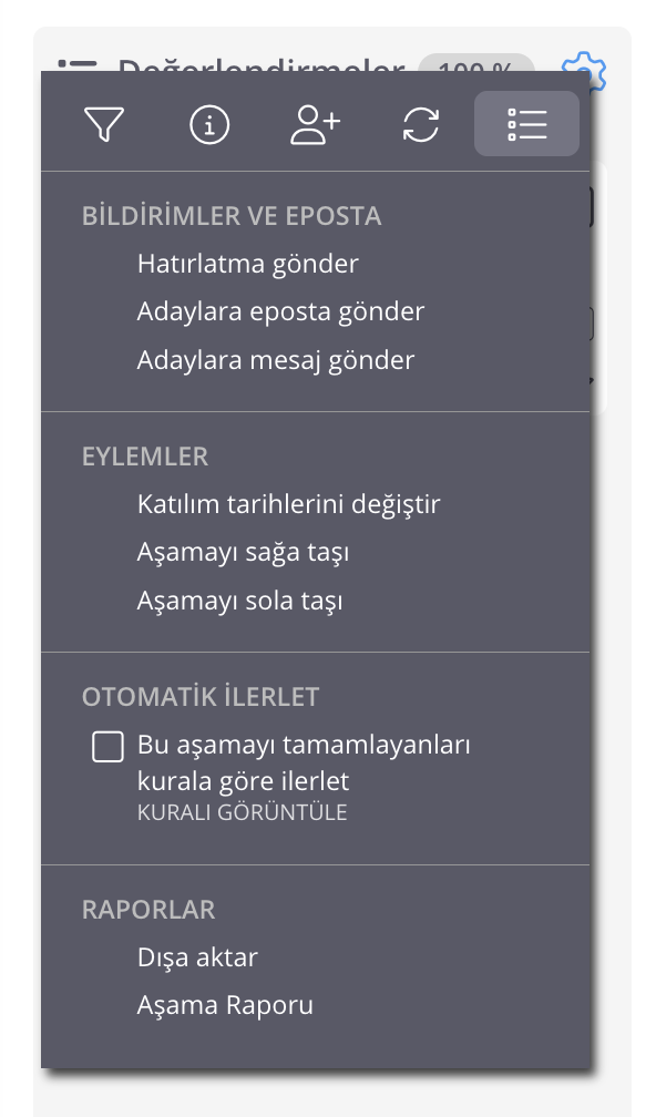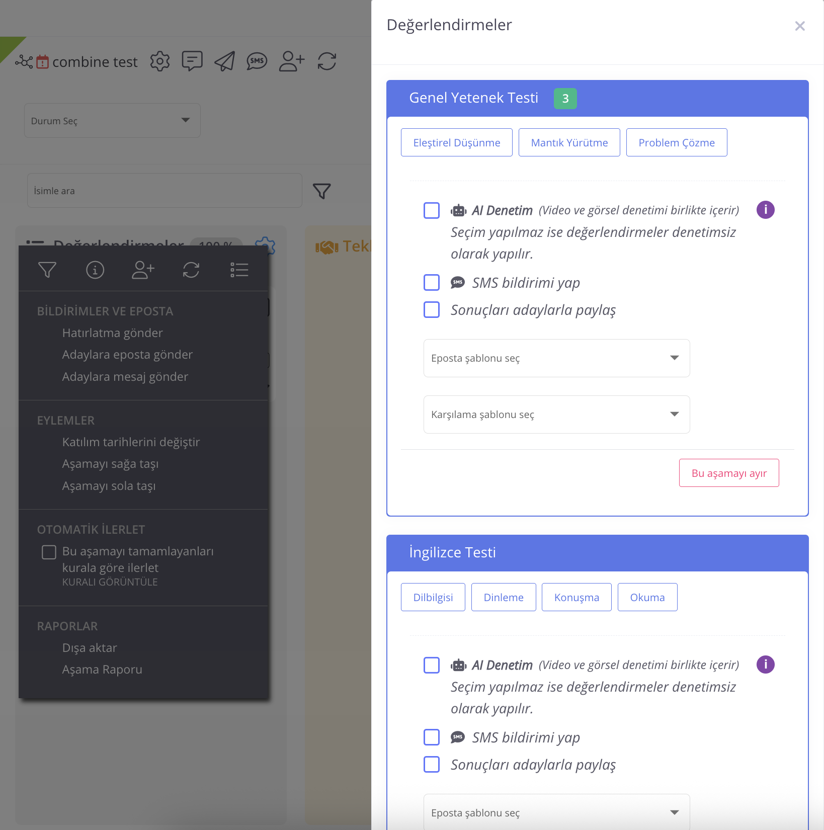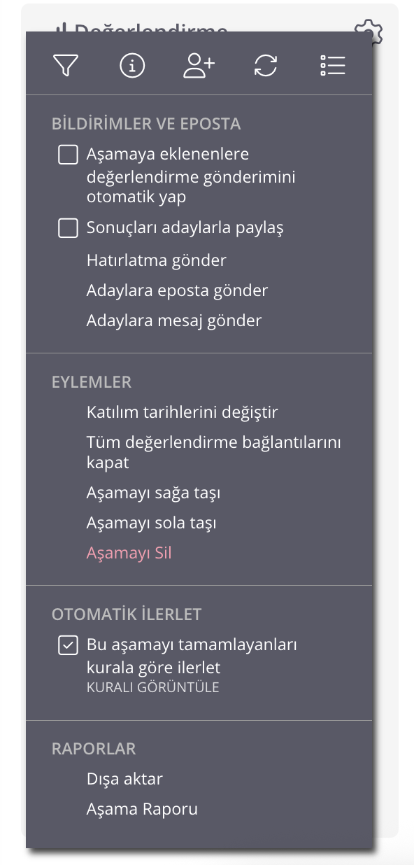 Aşama menüsünden değerlendirmeler ile ilgili detay görüntüleme, aşamaya aday ekleme, adaylara e-posta gönderme, aşama raporu indirme vb. bir çok işlem gerçekleştirilir.