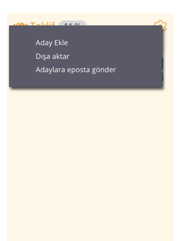 Aşama menüsünden aşamaya aday ekleme, adaylara e-posta gönderme, aşamaları sağa-sola taşıma işlemi gerçekleştirilir.