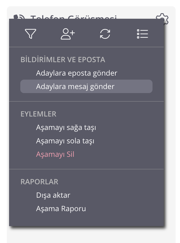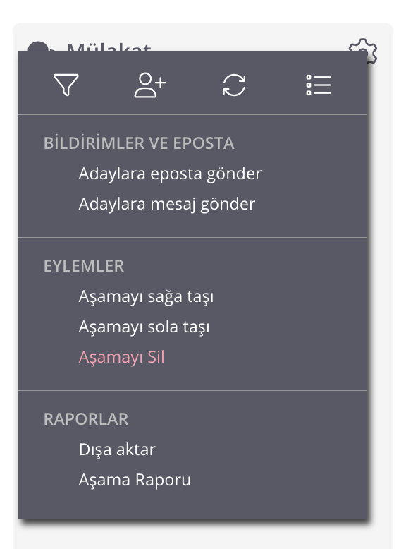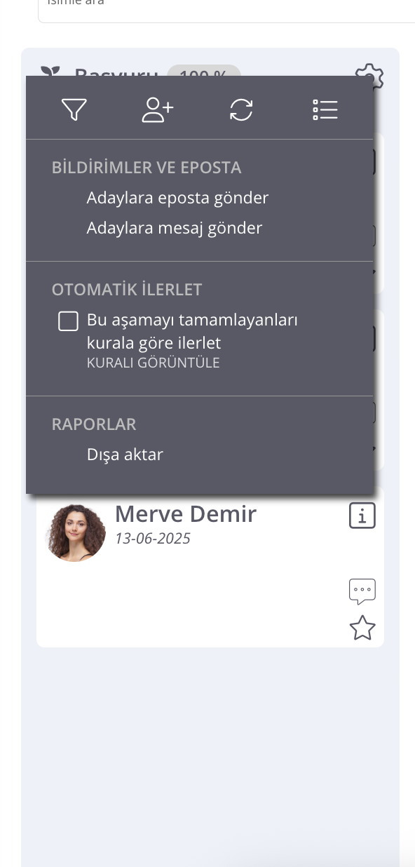 Aşama menüsünden aşamaya aday ekleme, adaylara e-posta gönderme, aşamaları sağa-sola taşıma ve rapor indirme işlemleri gerçekleştirilir.
