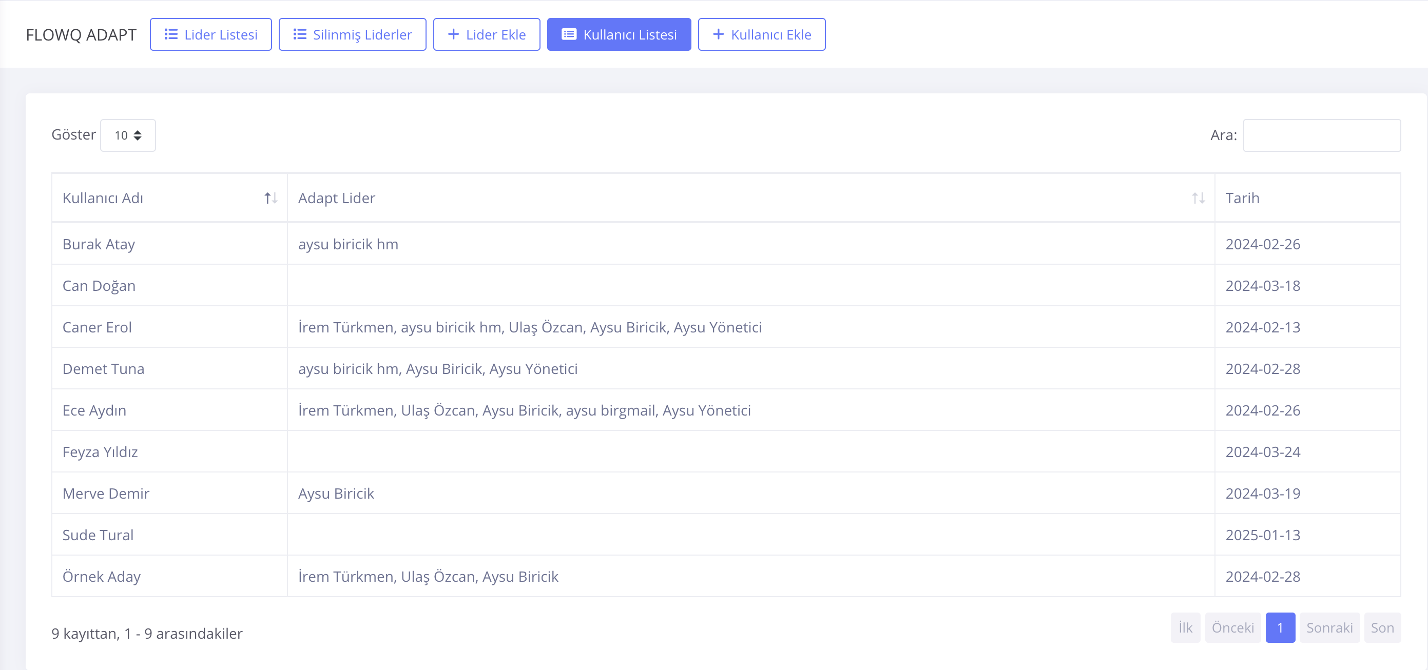 Kullanıcı Listesi: Liderin ekibine ekleyeceğimiz kullanıcıları öncesinde Kullanıcı ekle bölümünden Kullanıcı Listesine almamız gerekmektedir. Adapt için uygun olan tüm kullanıcıların hangi tarih eklendiği ve hangi liderlerin ekibinde bulunduğu bilgisi verilir.