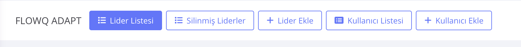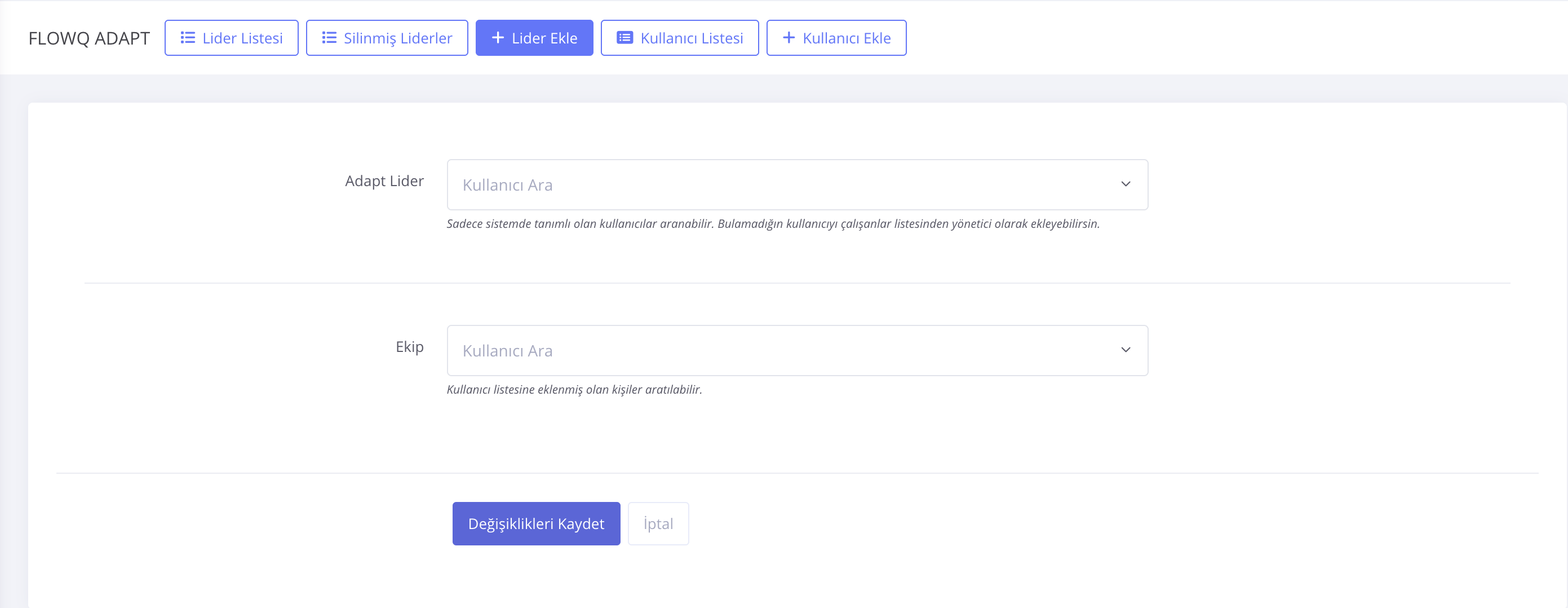FlowQ Adapt'a erişmek için sistemdeki sol menüden "FlowQ Adapt" başlığına tıklayın. Bu bölümde, lider ve kullanıcı ekleme işlemleri yapabilir ve liderlere ekibini oluşturup düzenleme imkanı bulabilirsiniz.