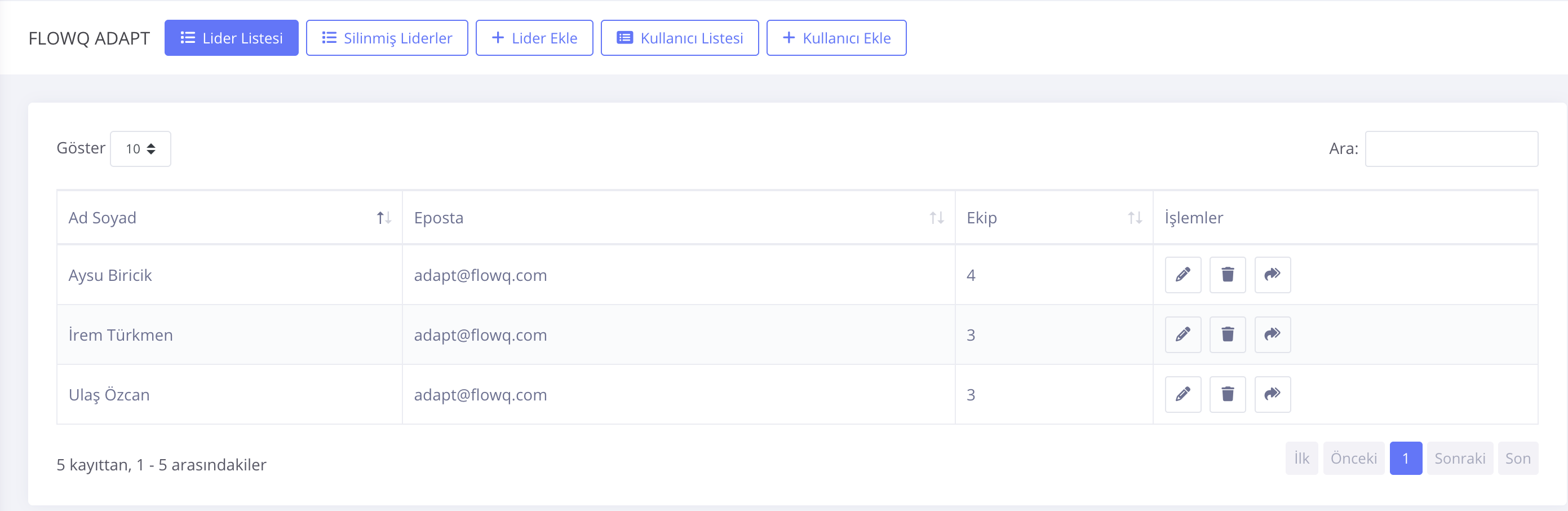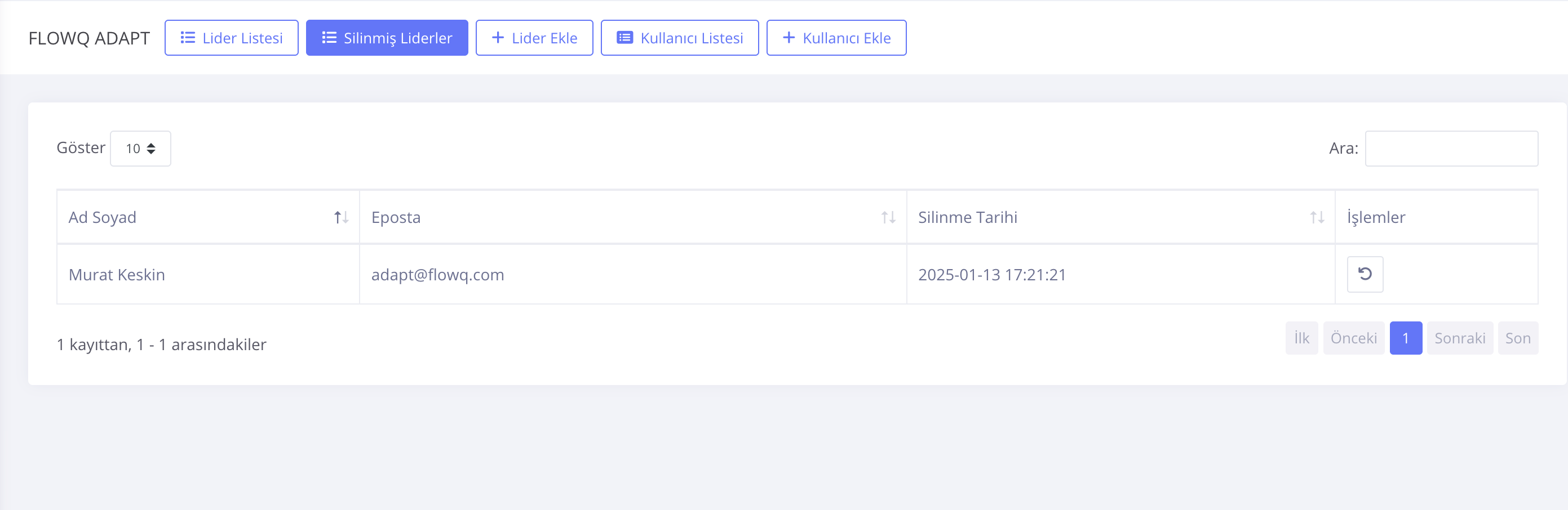 Lider Listesi ve Silinmiş Liderler: FlowQ Adapt'ın "Lider Listesi" bölümünde, tüm liderleri ve anlık olarak kaç tane ekip üyesi bulunduklarını görebilirsiniz.
