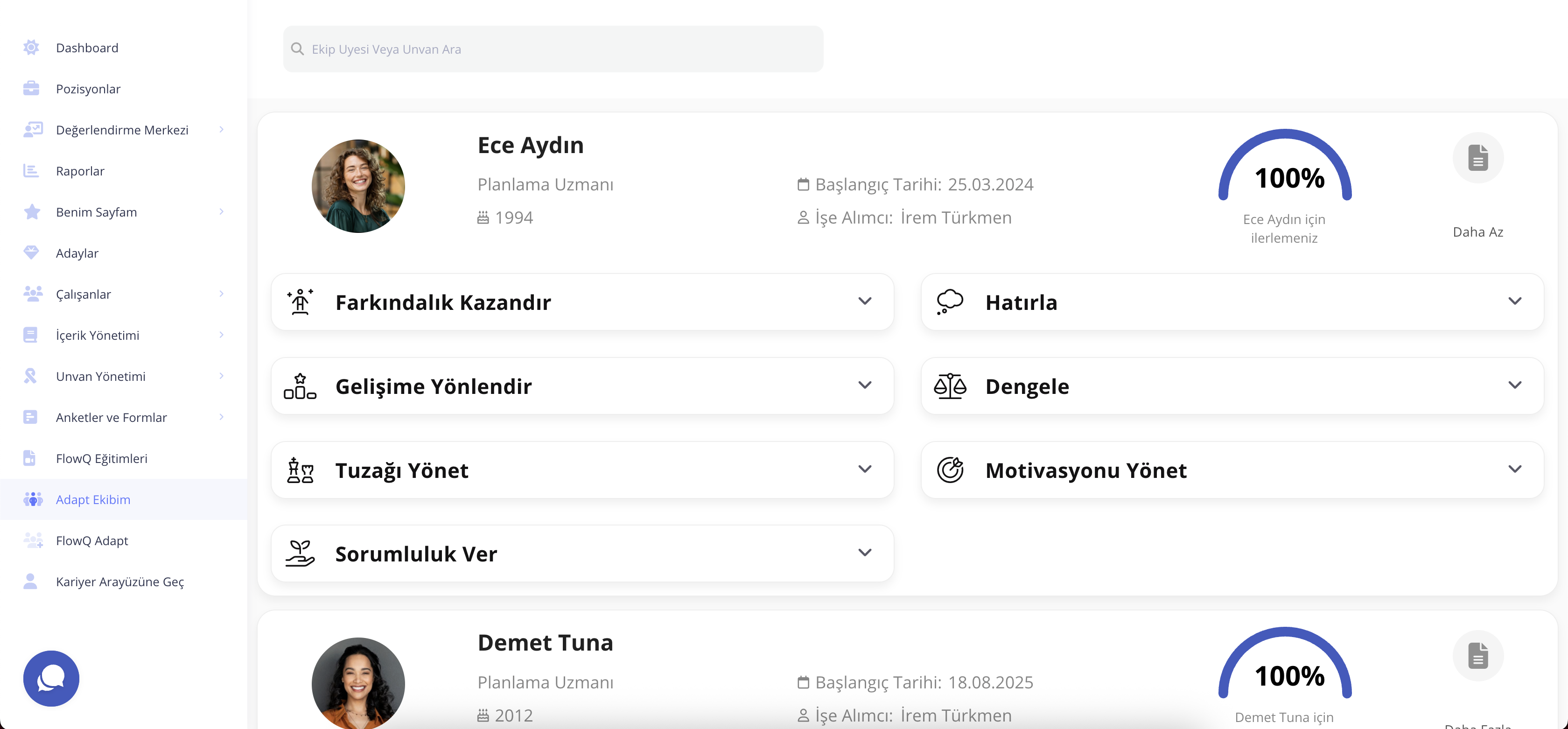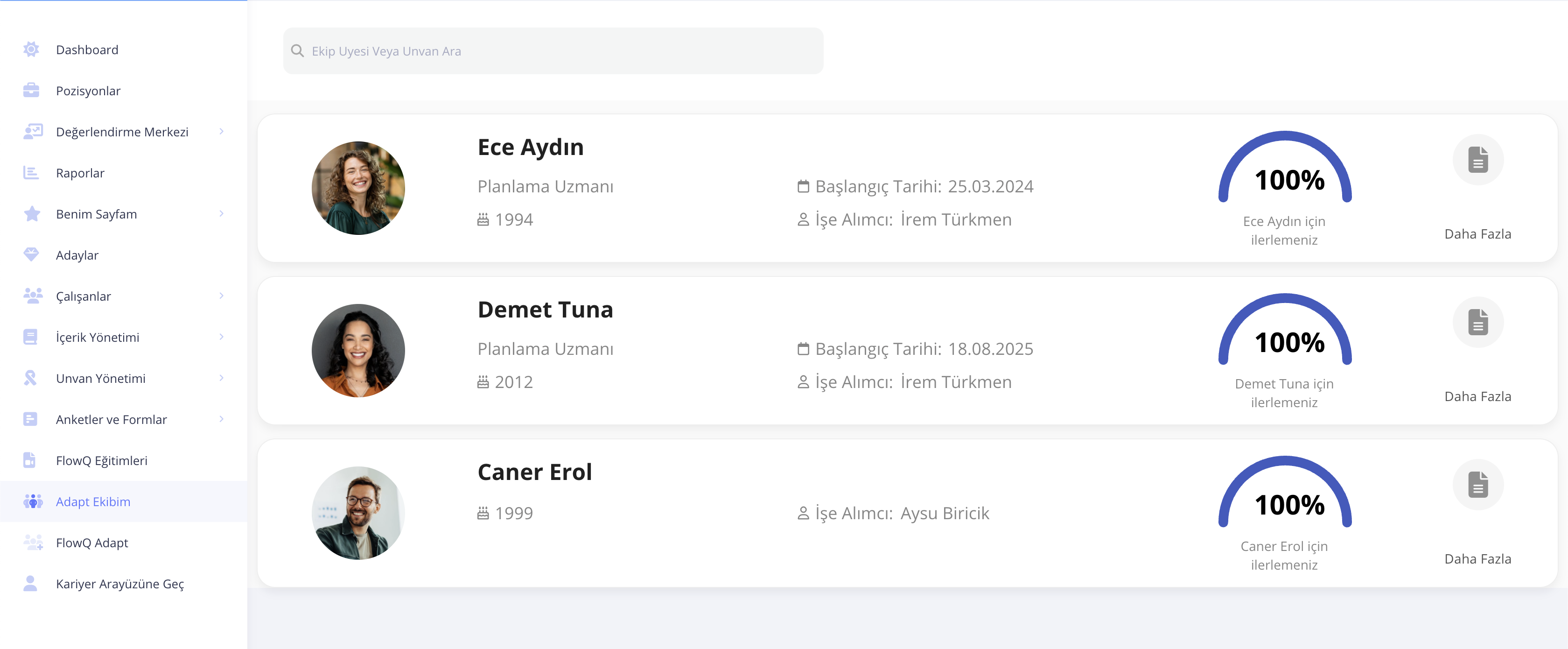 Sisteme yönetici olarak giriş yaptığınızda, yalnızca "Adapt Ekibim" başlığını görebilirsiniz. Bu, yalnızca yöneticilere ekibin performansını izleme yetkisi verir.