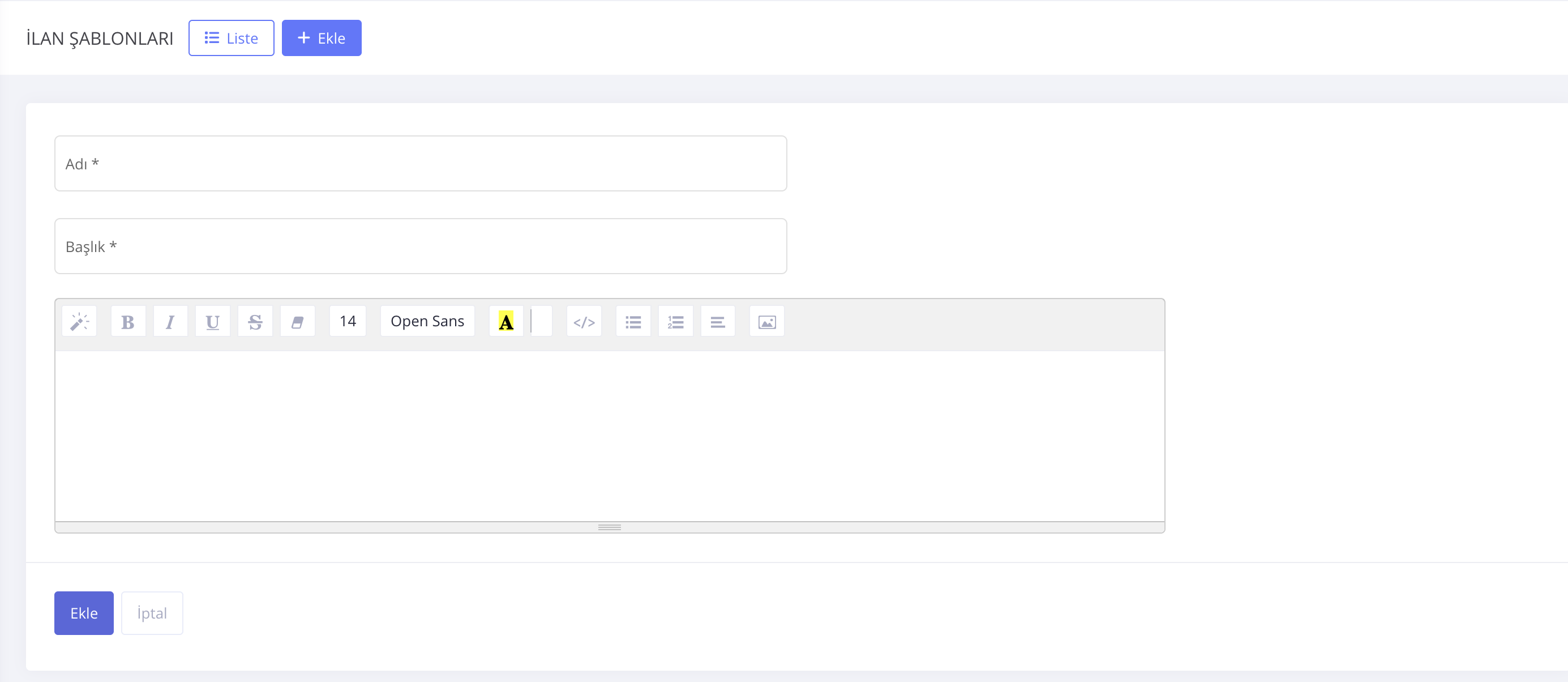 Yeni ilan oluşturma işlemi buradan gerçekleştirilir. İlanın adı, başlık ve ilan içeriği bilgileri doldurularak yeni ilan şablonu eklenir. İlan şablonuna resim eklenebilir.