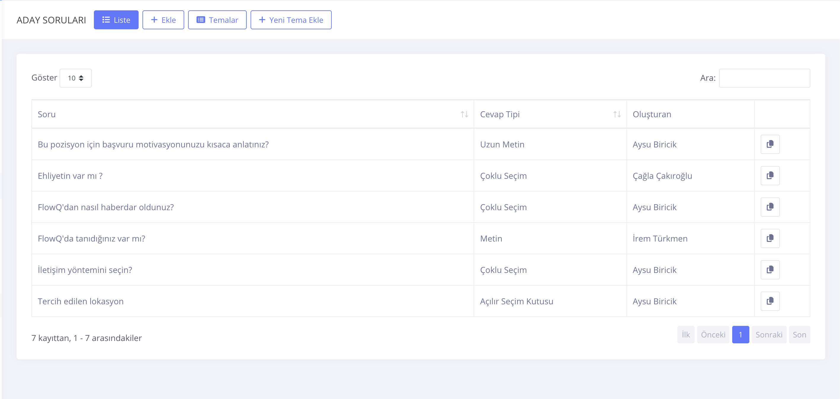 Aday Soruları listesi oluşturulmuş aday sorularının listelendiği alandır. Oluşturulmuş soruların görüntülenmesi dışında sorular İşlemler bölümünden düzenlenebilir ve silinebilir. Düzenleme ve silme işlemleri yalnızca soruyu oluşturan kişi tarafından gerçekleştirilebilir. Aday sorusu araması yapılabilir.