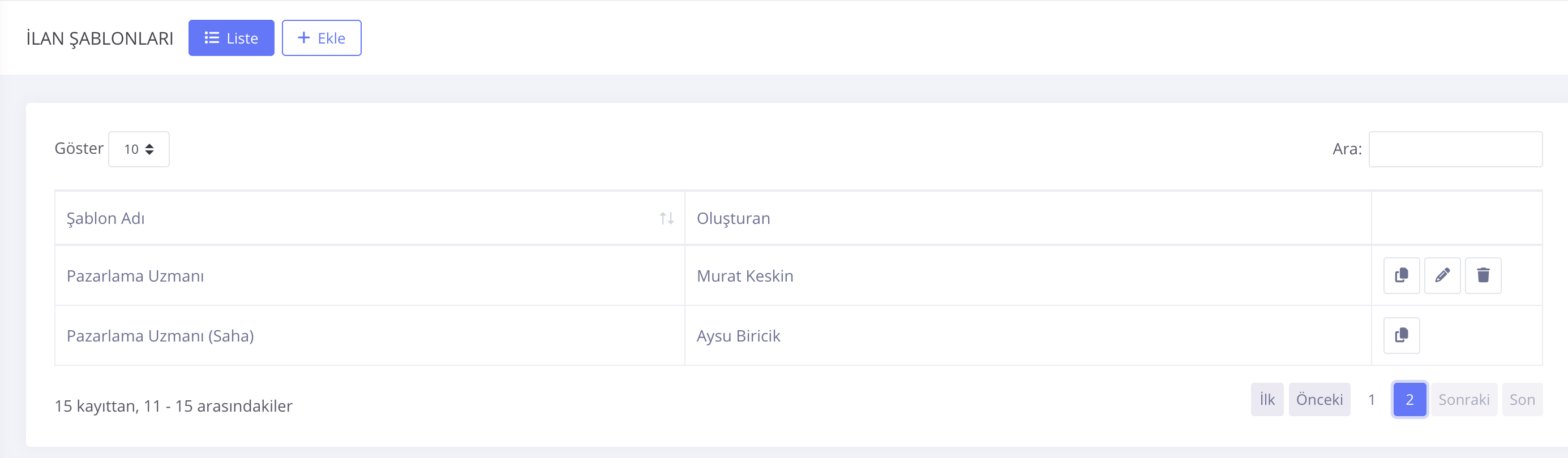 İlan şablonları listesi oluşturulmuş ilanların listelendiği alandır. Oluşturulmuş ilanların görüntülenmesi dışında ilanlar İşlemler bölümünden klonlanabilir, düzenlenebilir ve silinebilir. İlan şablonu araması yapılabilir.