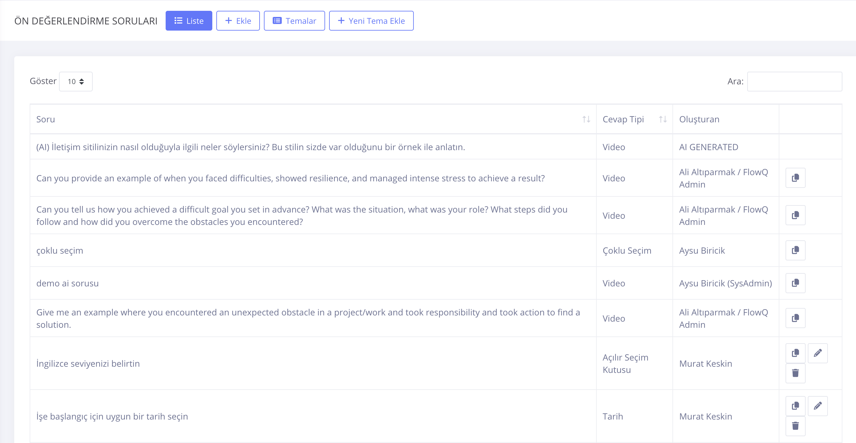 Ön Değerlendirme sorularının listelendiği alandır. Oluşturulmuş soruların görüntülenmesi dışında sorular İşlemler bölümünden klonlanabilir, düzenlenebilir ve silinebilir. Ön Değerlendirme sorusu araması yapılabilir.