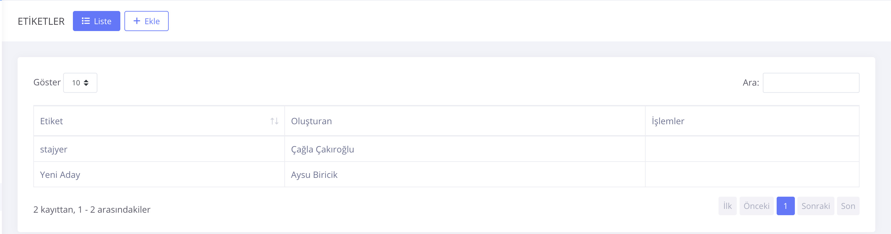 Etiketler listesi oluşturulmuş etiketlerin listelendiği alandır. Oluşturulmuş etiketlerin görüntülenmesi dışında etiketler İşlemler bölümünden düzenlenebilir ve silinebilir. Düzenleme ve silme işlemleri yalnızca etiketi oluşturan kişi tarafından gerçekleştirilebilir. Etiket araması yapılabilir.