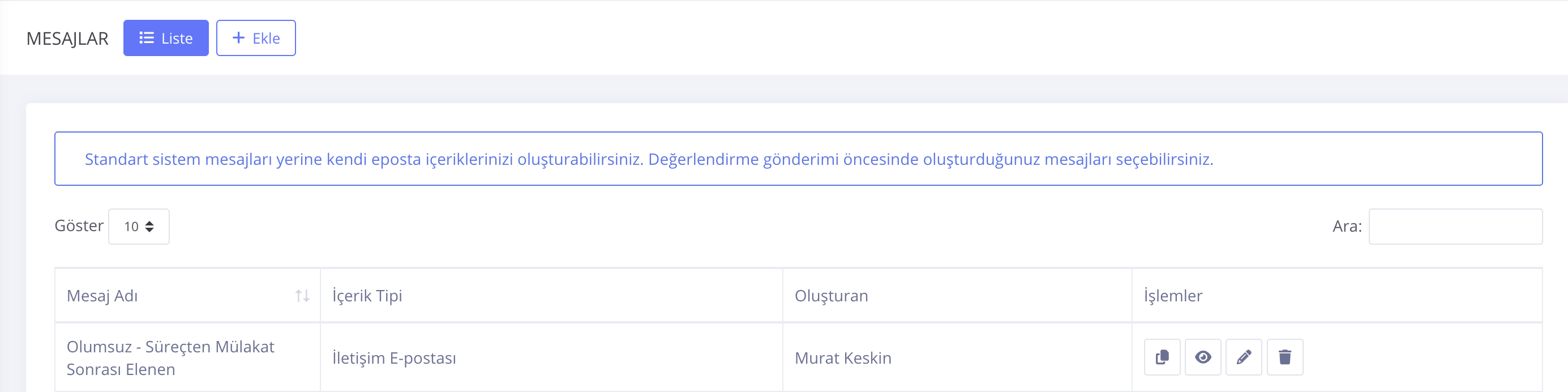 Mesajlar listesi oluşturulmuş e-postaların listelendiği alandır. Oluşturulmuş e-postaların görüntülenmesi dışında mesajlar İşlemler bölümünden klonlanabilir, düzenlenebilir ve silinebilir. Mesaj araması yapılabilir.