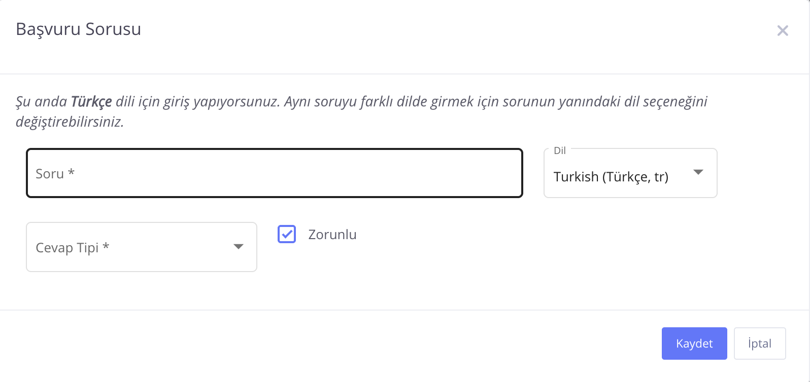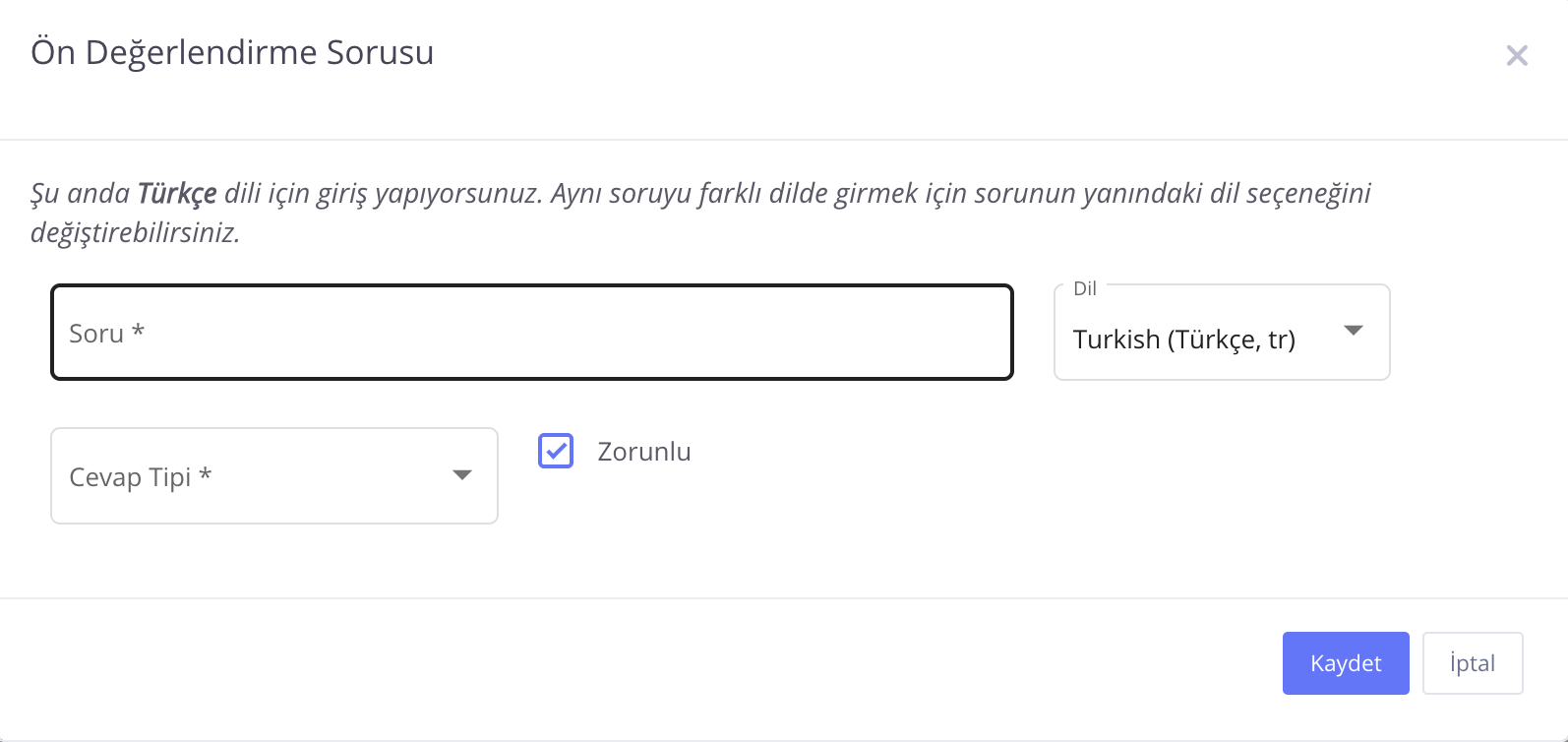Yeni soru oluşturma işlemi buradan gerçekleştirilir. Soru, cevap tipi ve dil bilgileri doldurularak yeni interaktif mülakat sorusu eklenir.