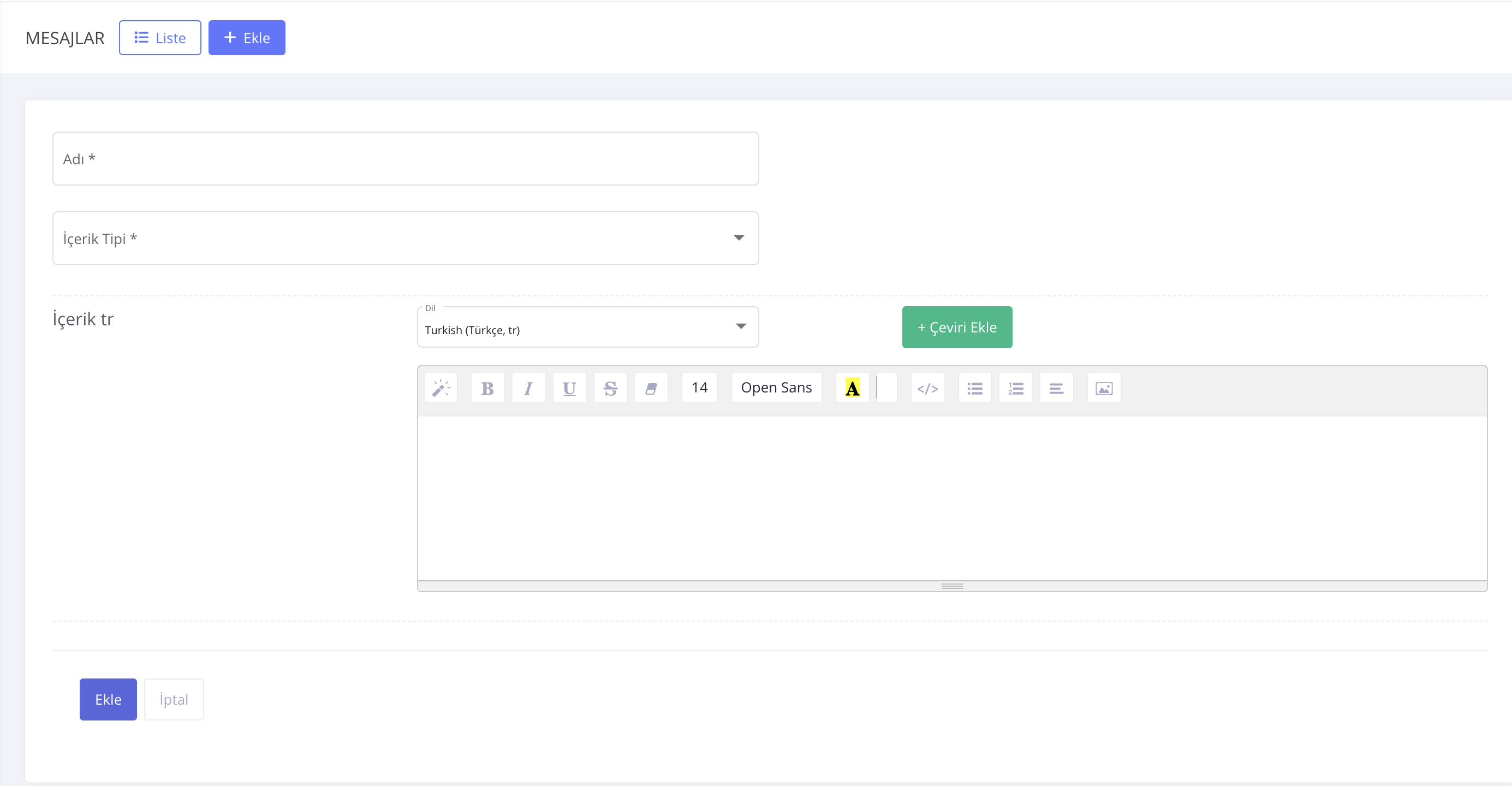 Yeni mesaj oluşturma işlemi buradan gerçekleştirilir. Mesajın adı, içerik tipi ve mesaj içeriği bilgileri doldurularak yeni mesaj eklenir. Mesaja çeviri ve resim eklenebilir.