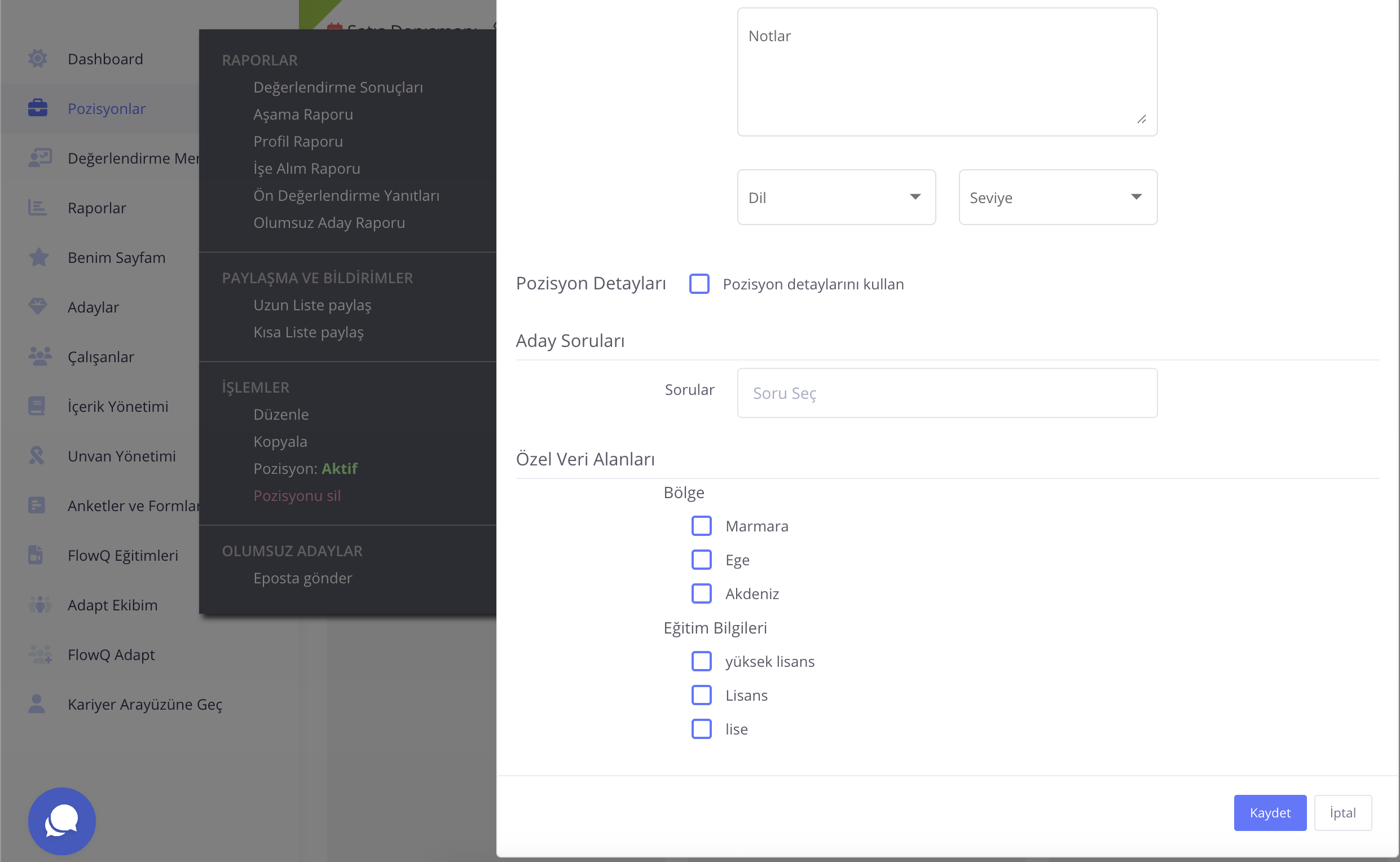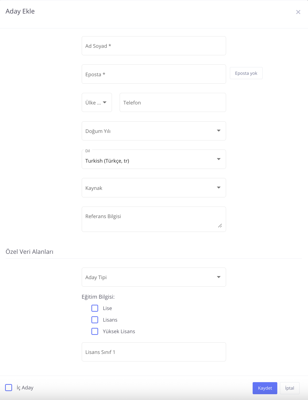 Pozisyon menüsünden Aday Ekle > Yeni Ekle seçeneği ile pozisyona eklediğiniz adaylarda özel veri alanını kullanabilirsiniz.