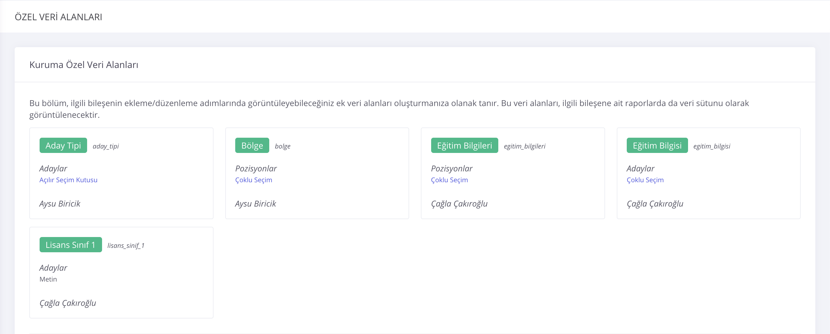 ℹ️ Özel veri alanlarını Company Admin rolü tanımlı kullanıcılar oluşturabilir.