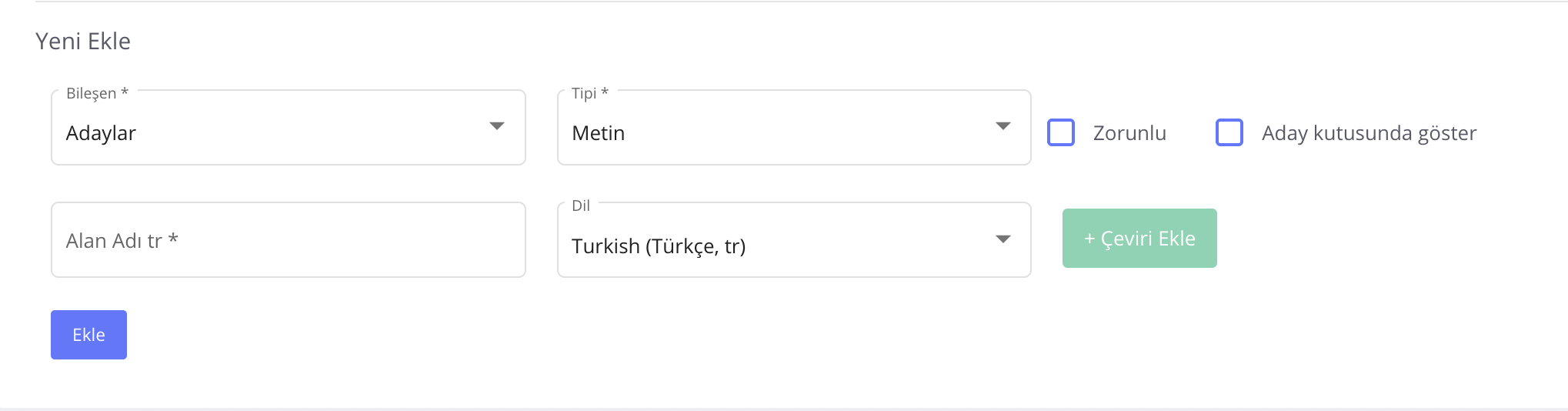 Oluşturduğunuz özel veri alanını, dilerseniz ''Zorunlu'' kılabilir veya ''Aday Kutusunda Göster'' seçeneklerini işaretleyebilirsiniz.