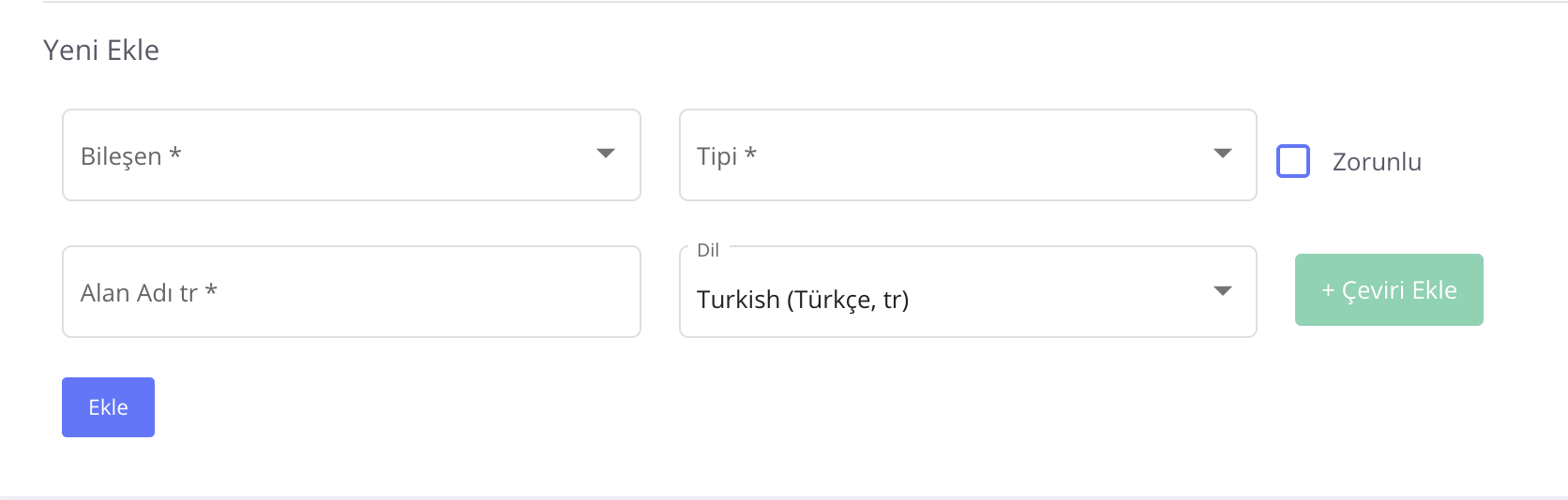 Özel veri alanlarını İçerik Yönetimi > Özel Veri Alanları > Yeni Ekle aracılığıyla oluşturabilirsiniz.