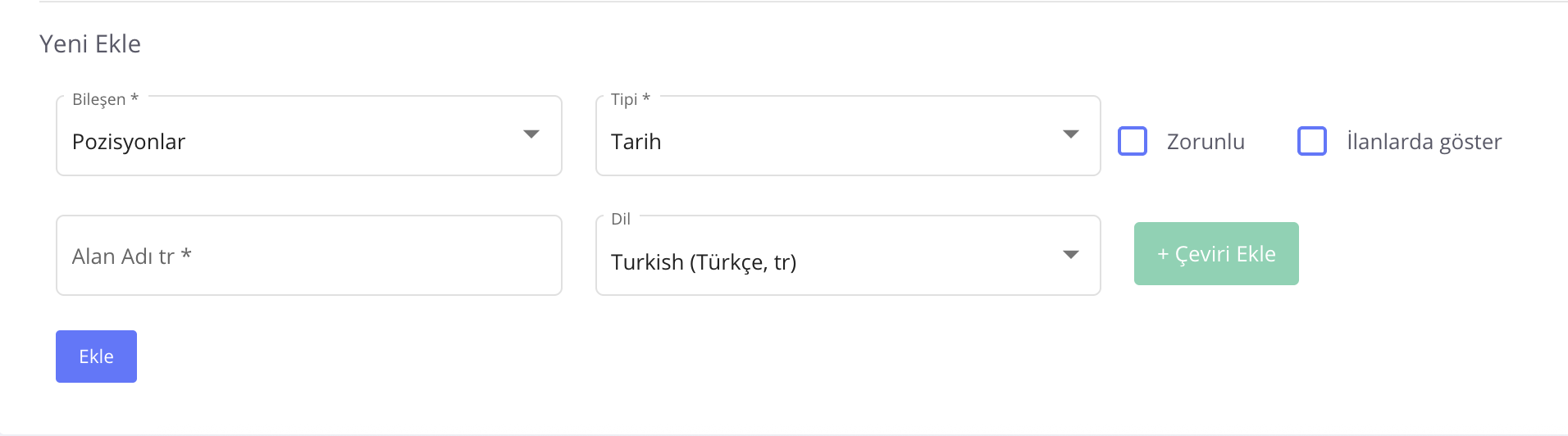Pozisyonlara özel veri alanlarını İçerik Yönetimi > Özel Veri Alanları > Yeni Ekle aracılığıyla oluşturabilirsiniz.