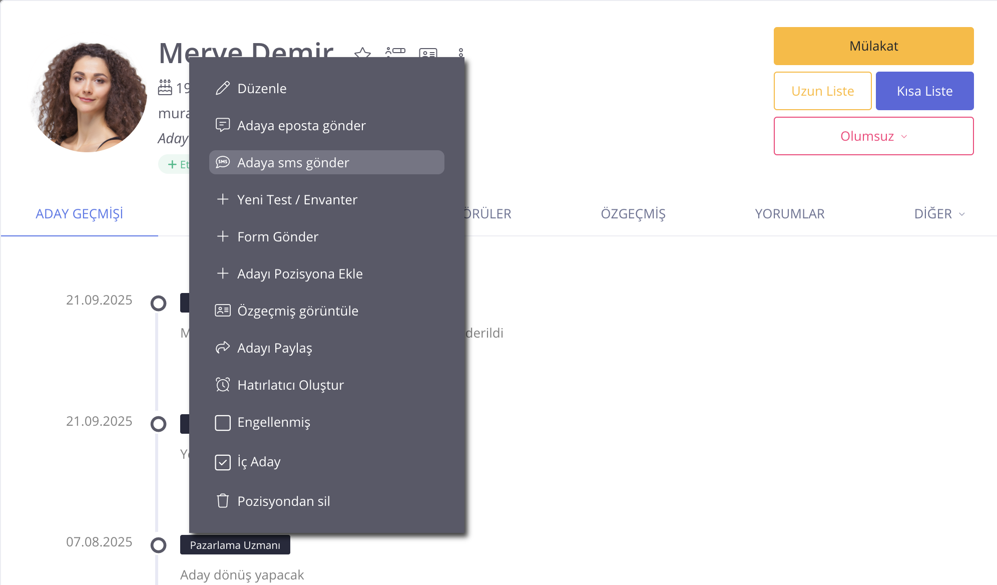 Pozisyon içerisinden veya Adaylar menüsünde aratılan adayların aday kartından SMS gönderimi yapabilirsiniz.