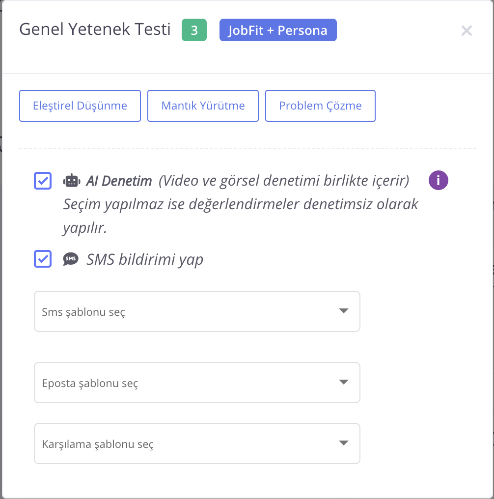 Yeni pozisyon açarken İçerik Seçimleri aşamasındaki Test/Envanter düzenleme bölümünden “SMS bildirimi yap” seçildiğinde otomatik olarak SMS şablonu seç kutusu açılır ve şablon seçebilirsiniz.