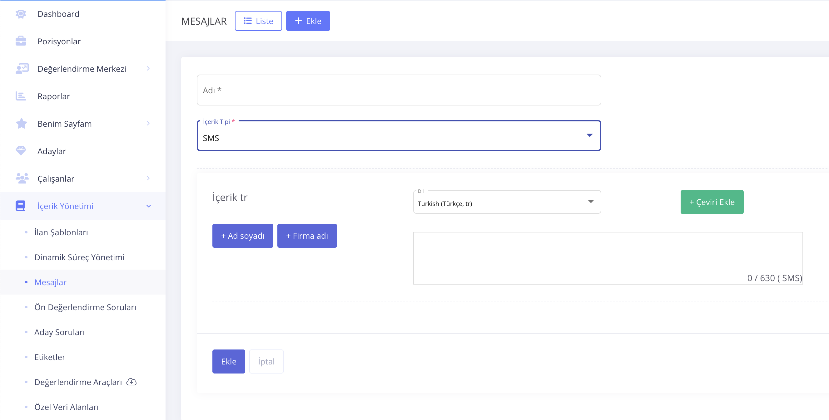 Adaylara yeni pozisyon oluştururken, pozisyon içerisinden veya aday kartından SMS gönderimi yapabilirsiniz. Özel SMS içerikleri oluşturup şablon haline getirebilirsiniz.