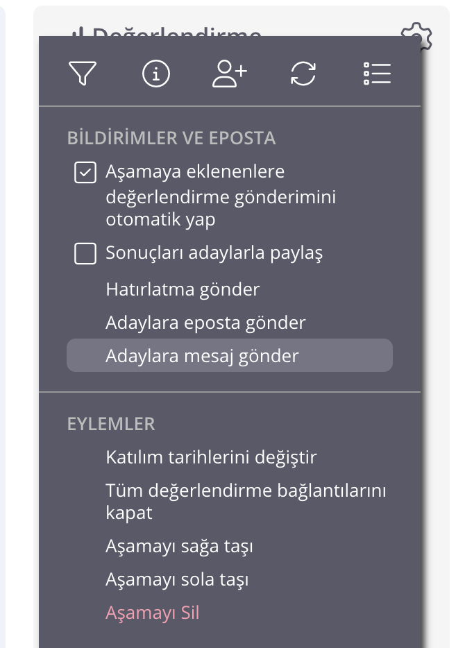 Aşama menüsünden “Adaylara mesaj gönder” seçeneğini kullanarak aşamada bulunan adaylar için özel SMS içeriği oluşturulup SMS gönderebilirsiniz. Ayrıca şablon seçerek de SMS gönderimi yapabilirsiniz.