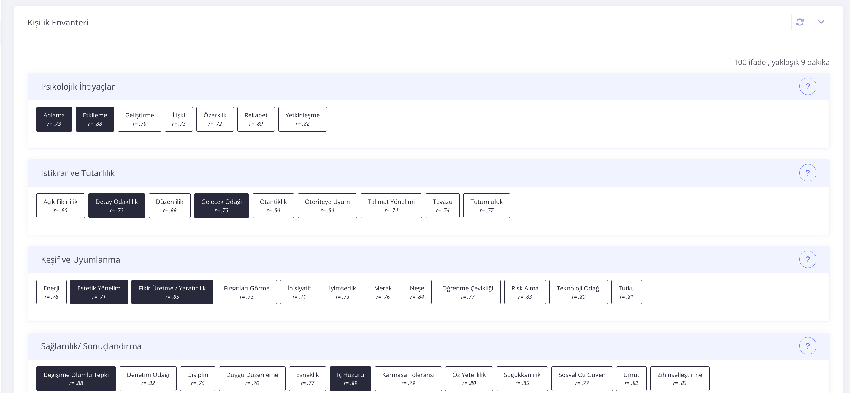 Uygulanacak kişilik envanteri boyutlarını görmek için, sağdaki ok işaretine tıklanır. Pozisyon oluştururken değerlendirme aracı seçimi yapıldıysa boyutlar seçili gelir. Seçili boyutlar kapsamında envanterde bulunan ifade sayısı ve envanterin kaç dakika süreceği görünür. Seçili boyutlar üzerine ek boyut seçilebilir. Soru işareti butonundan boyutların neyi ölçtüğü bilgisine ulaşılabilir. Uygulamaya son katılım tarihi girilir.
