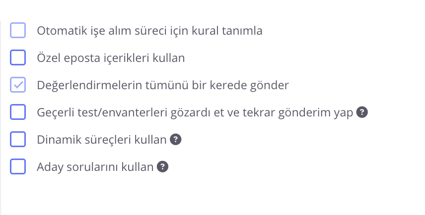 Toplu Değerlendirme göndermek için, Otomatik işe alım süreci için kural tanımla seçeneği sabit ve kapalı, Değerlendirmelerin tümünü bir kerede gönder seçeneği sabit ve açıktır.