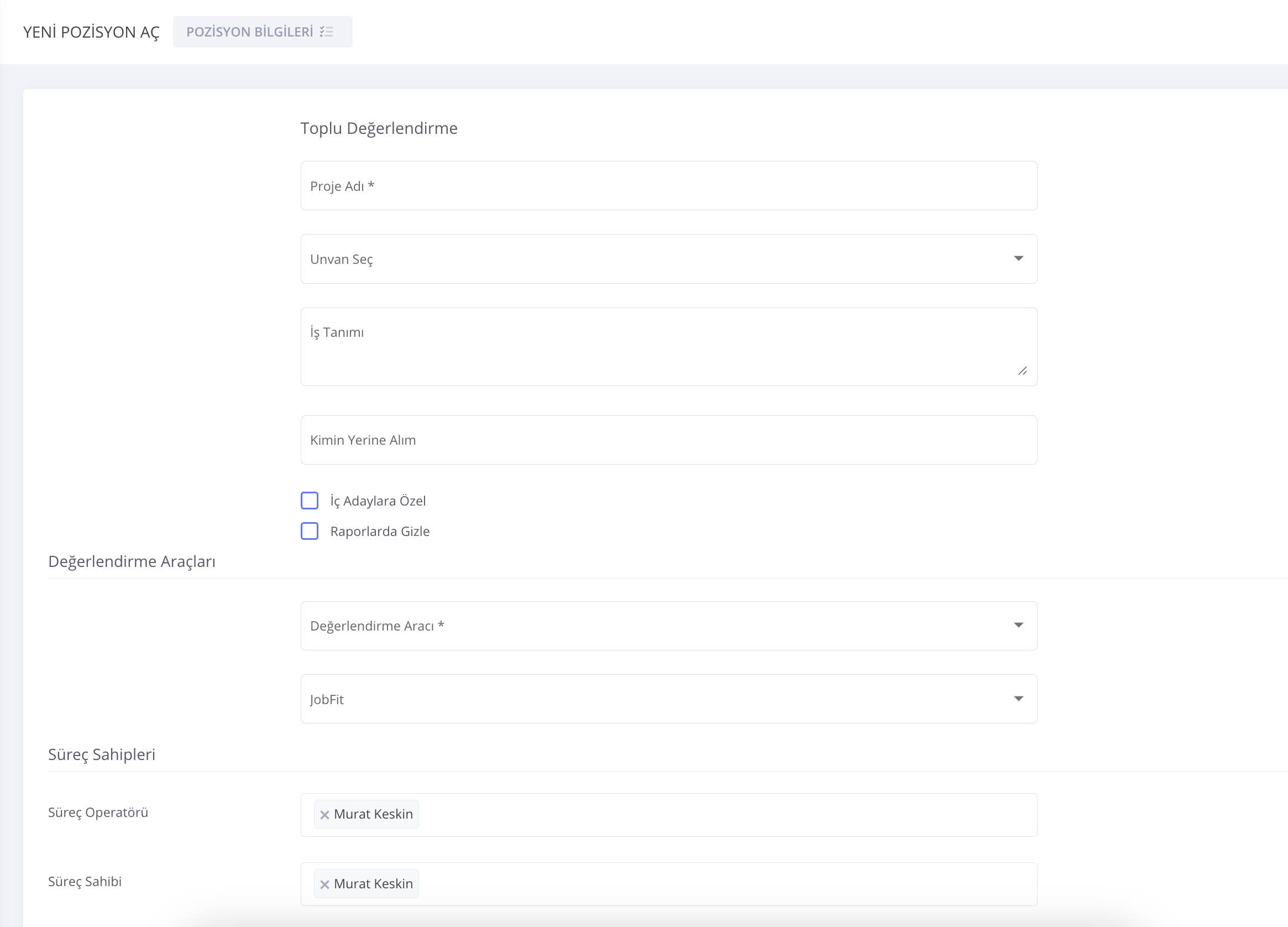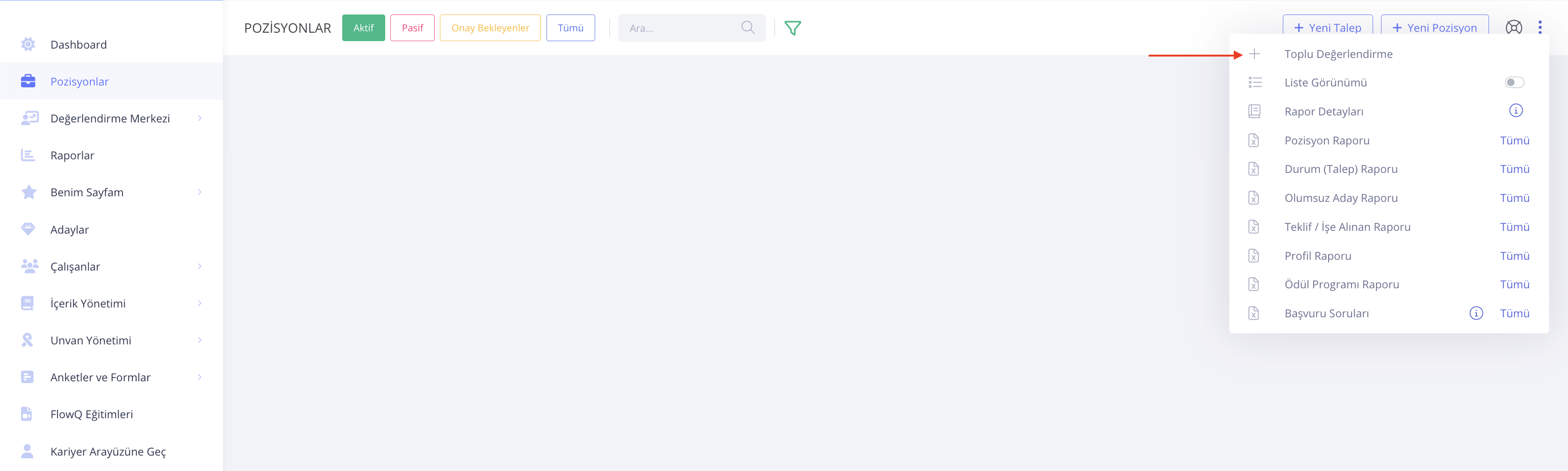 Toplu Değerlendirme göndermek için Pozisyonlar sekmesinde en sağda bulunan üç noktadan 'Toplu Değerlendirme' seçeneğine tıklanır.