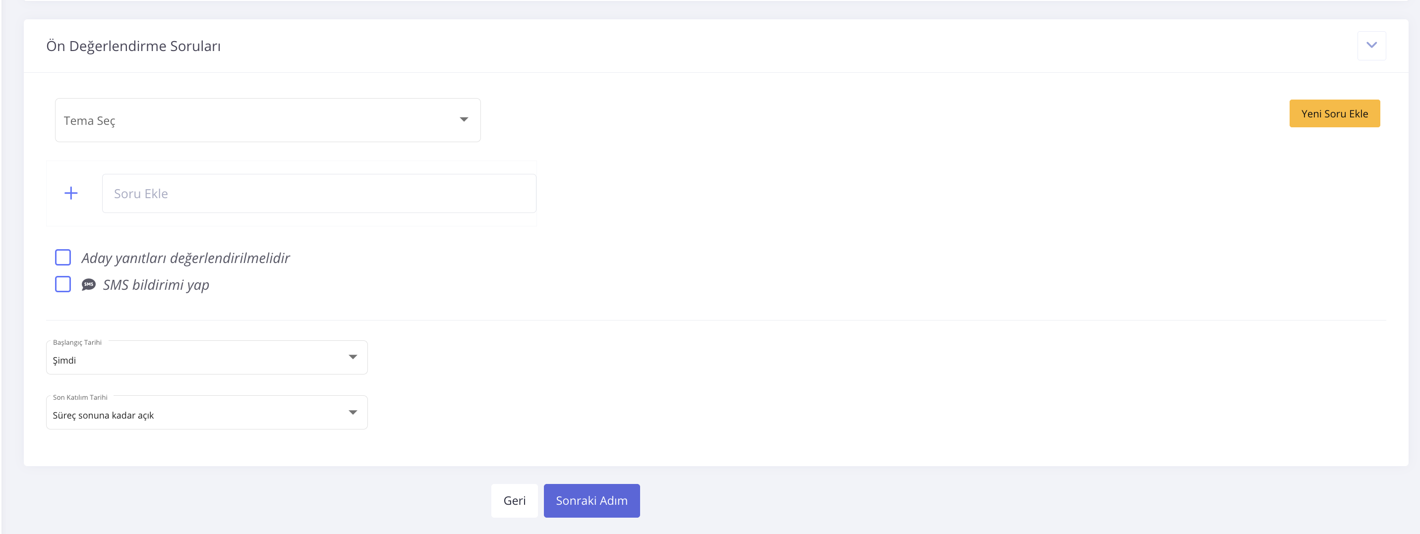 İnteraktif mülakat değerlendirmesi seçilmesi durumunda, İnteraktif Mülakat aşamasında sorulacak soru seçimleri yapılır veya yeni soru oluşturulur. Son katılım tarihi bölümünden adaylara soruları tamamlamaları için belirli bir süre tanımlanabilir veya süreç sonuna kadar adayların sorulara ulaşması tercih edilebilir.