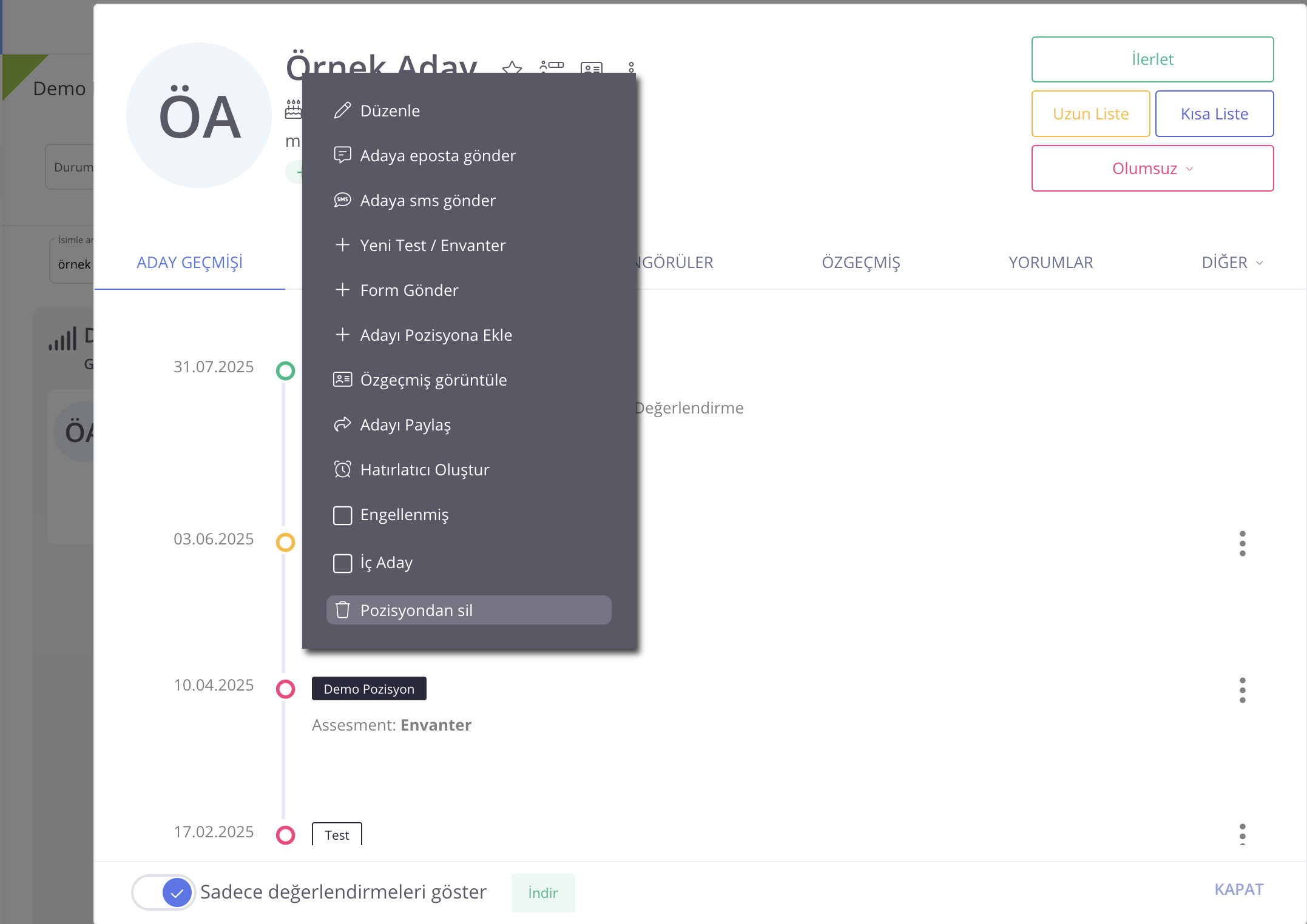 Adayı bir pozisyondan silmek için; ilgili pozisyon içerisindeki adayın, aday kartı menüsündeki Pozisyondan Sil işlemi gerçekleştirilir.