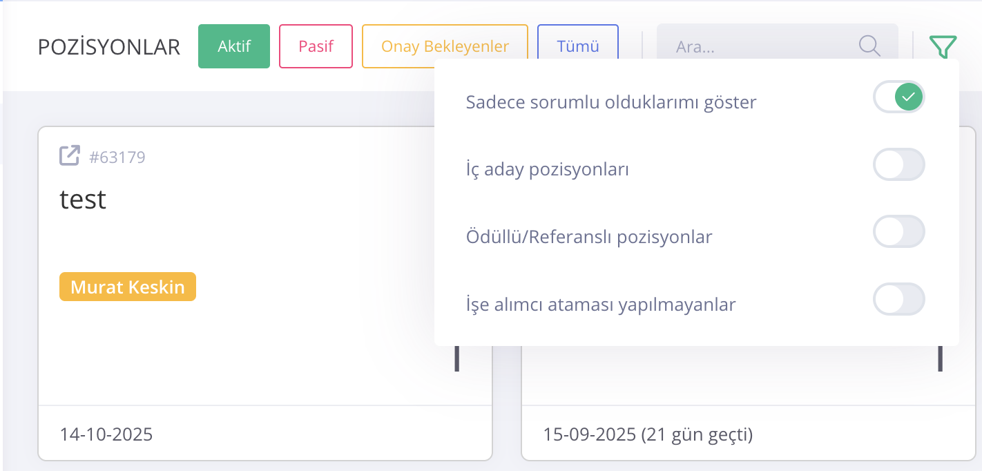 Pozisyonlar bölümünde bulunan "Sadece sorumlu olduklarımı göster" filtresi aktif olduğunda işe alımcılar kendilerine ait pozisyonları görüntüler; filtre aktif edilmediğinde ise bağlı oldukları gruba ait tüm pozisyonları görüntüleyebilirler.