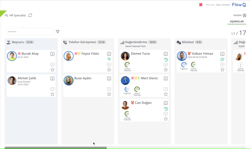 Pozisyon seçimi yapıldıktan sonra, ilgili pozisyonun adayları ve bu adayların hangi işe alım aşamasında olduklarını gösteren Kanban Board'u görebilirler. Bu board üzerinde adayların ilerleyişi kolayca takip edilebilir.